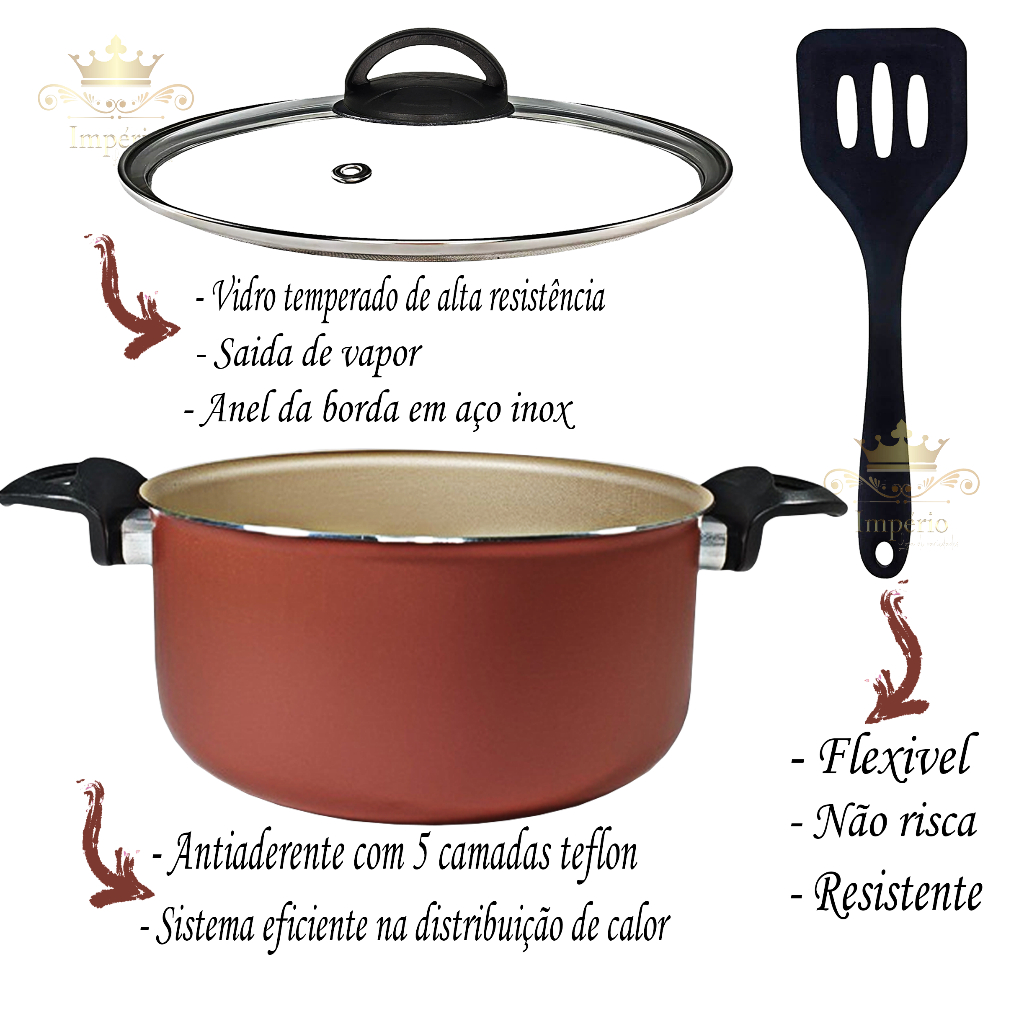 Panela Caçarola Grande 20 cm com Tampa de Vidro Com Espátula Antiaderente 5 Camadas De Teflon Cor Cereja Gold Dourada Cobre Panela Avulsa Grande Com Utensilio