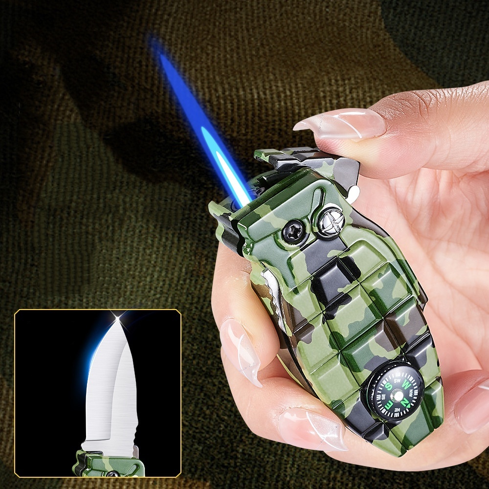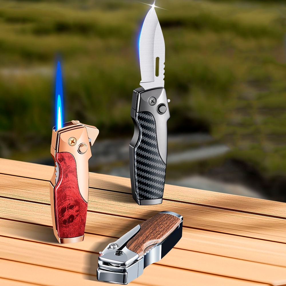 Canivete multifuncional com isqueiro embutido, versátil e com trava de segurança.