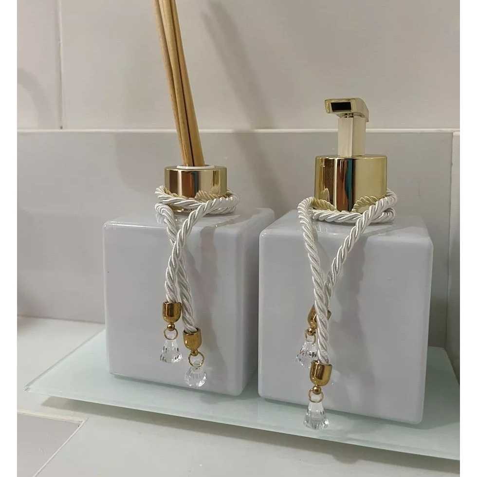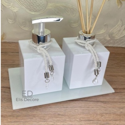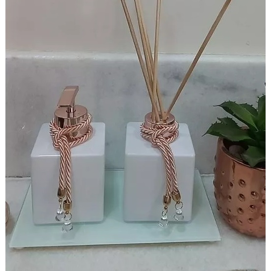 Kit Lavabo Cubo Branco 250ml Difusor De Ambiente E Sabonete Líquido Bandeja Varetas