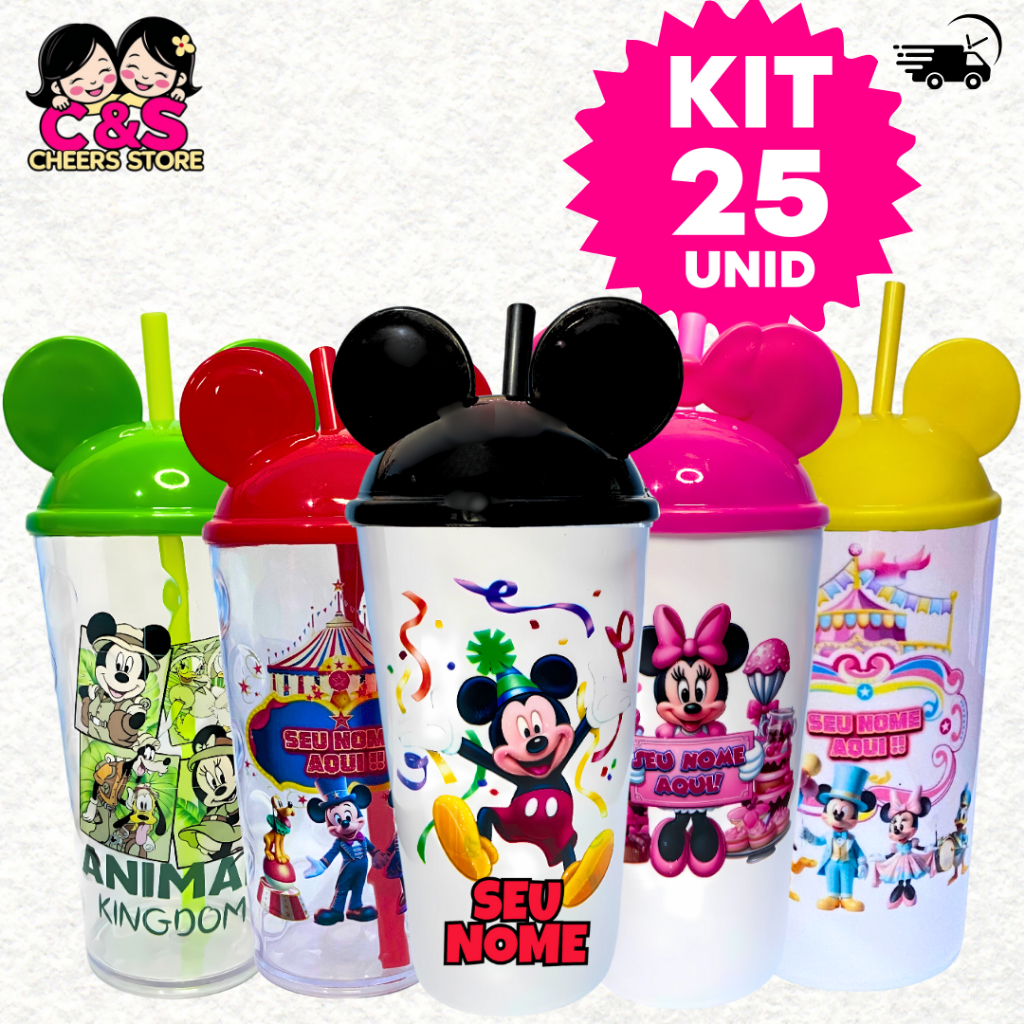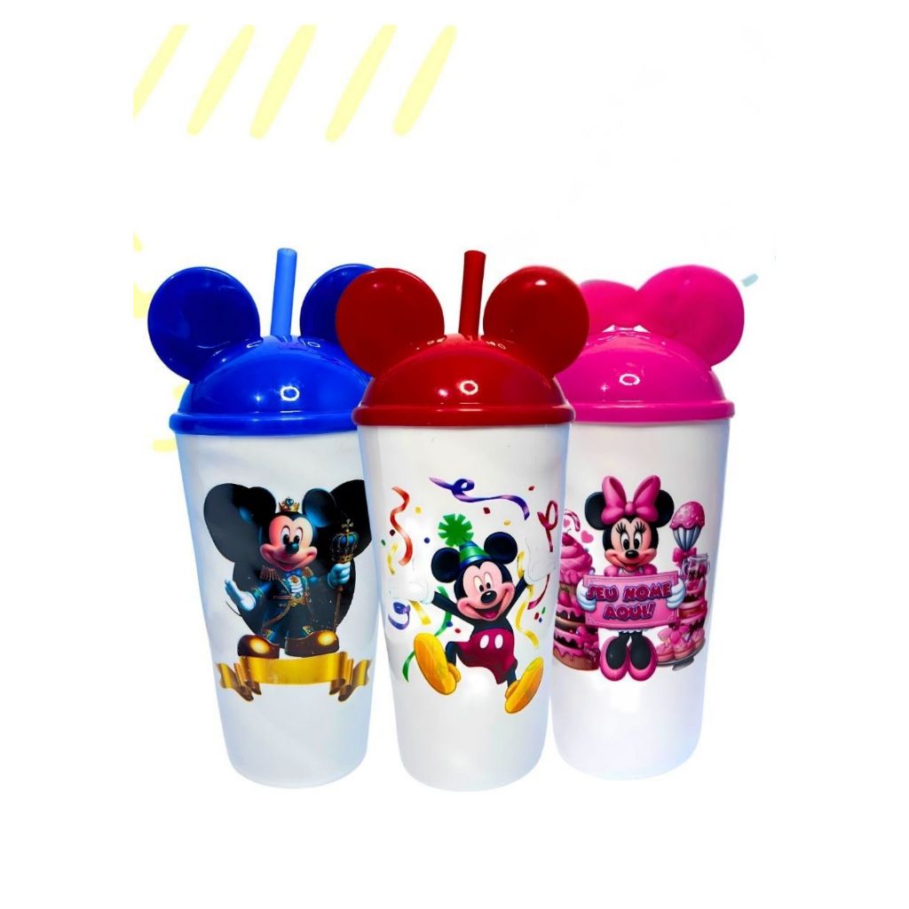 Kit 25 Copos Personalizado (DISNEY MICKEY) Com Tampa Orelha e Canudo 500 ML