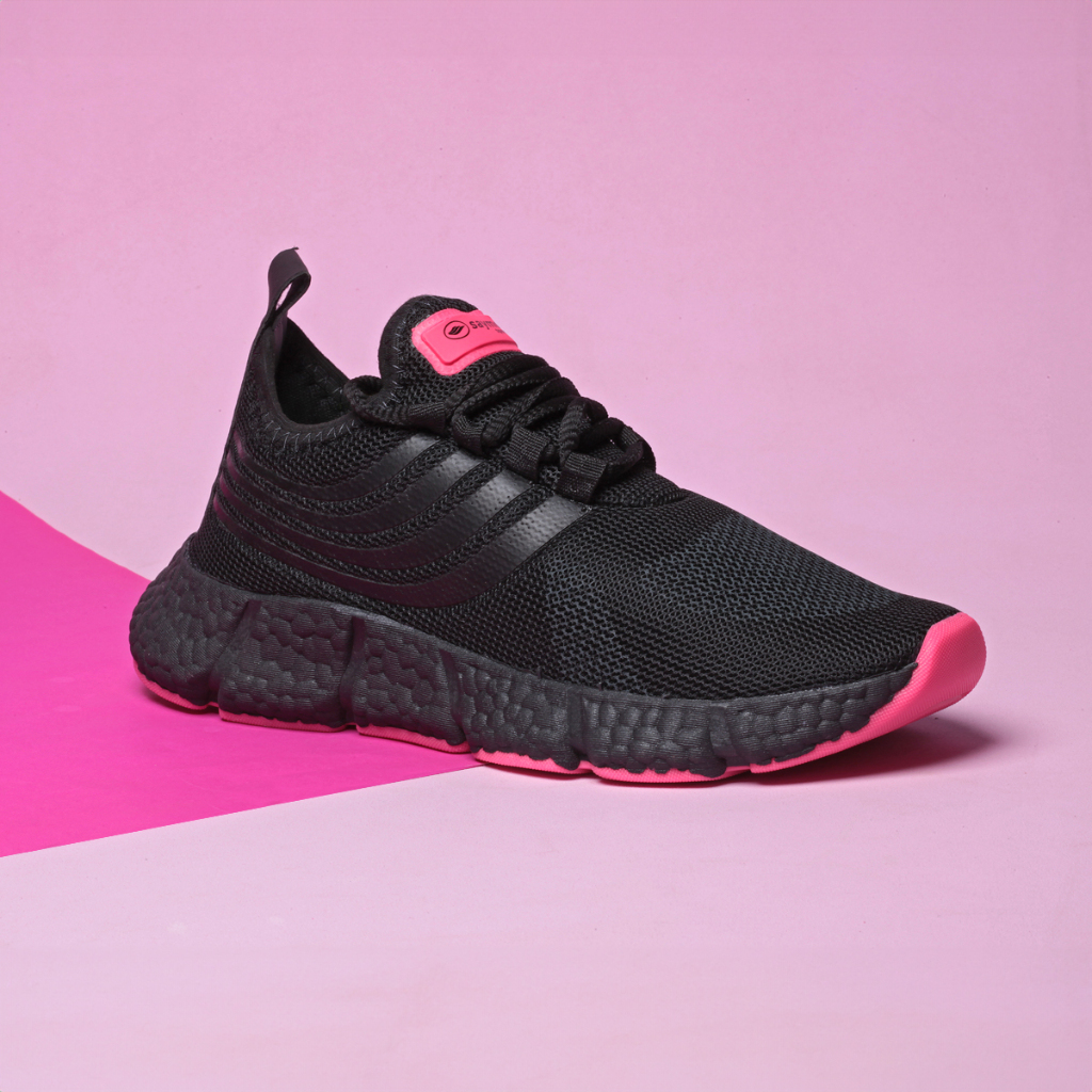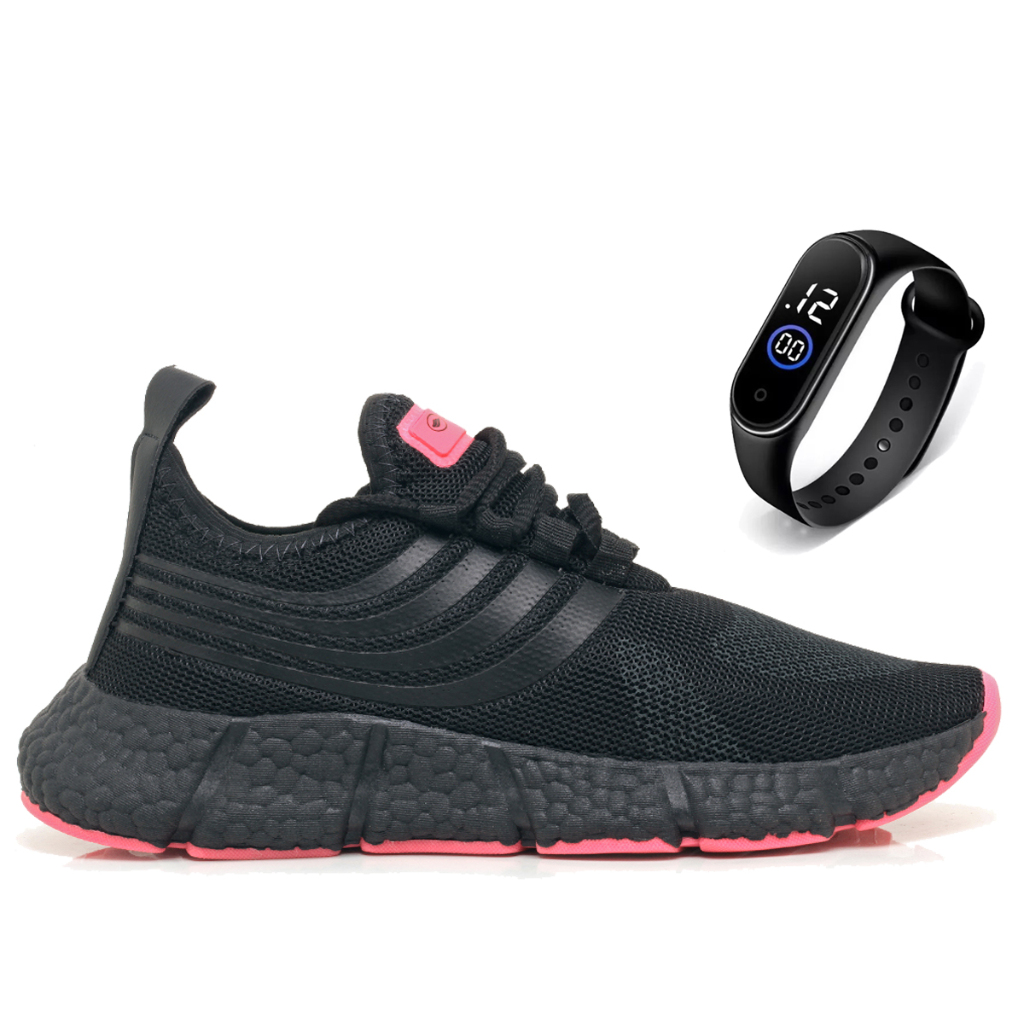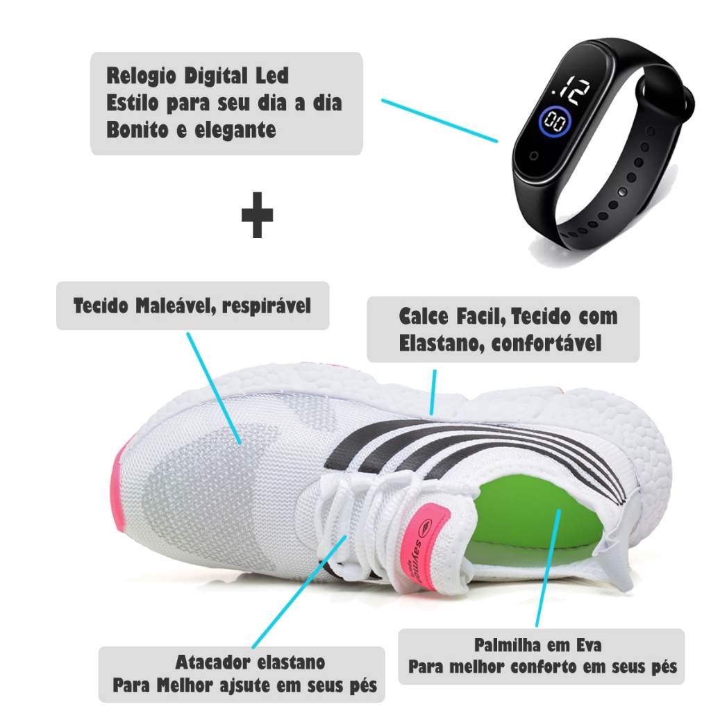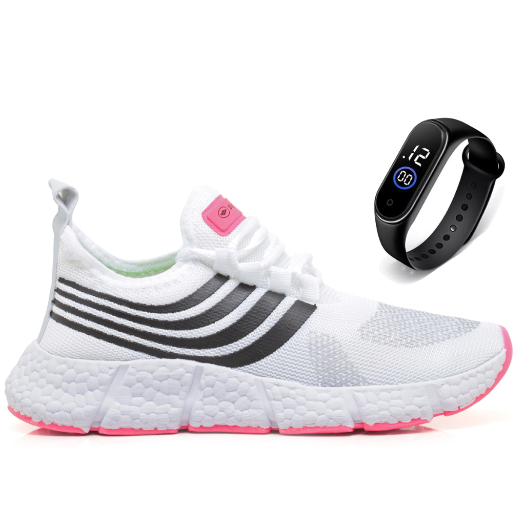Kit Tênis Feminino Original Academia Branco Preto Rosa Fast Yy + Relógio Digital New