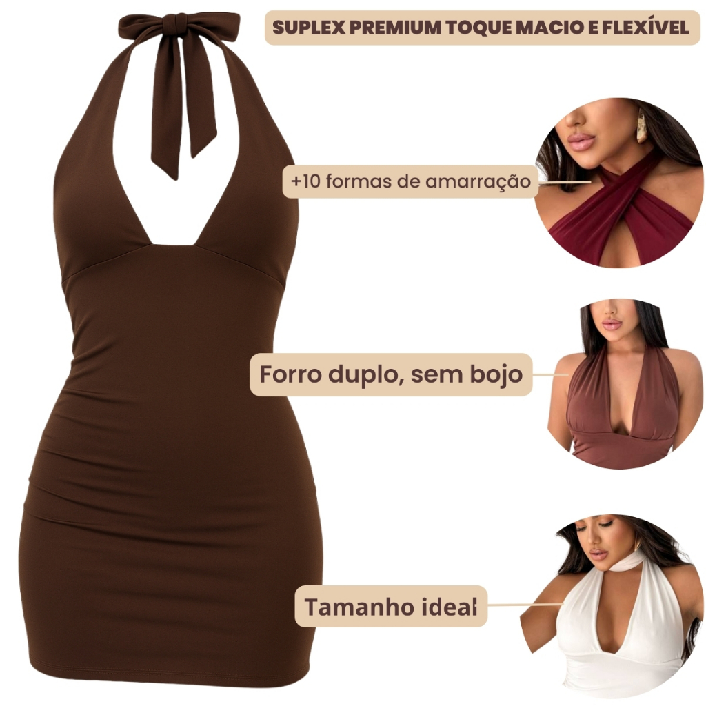 Vestido Curto Multiformas Costa Nua Amarração Decote Feminino Suplex de Poliamida 10 formas de uso