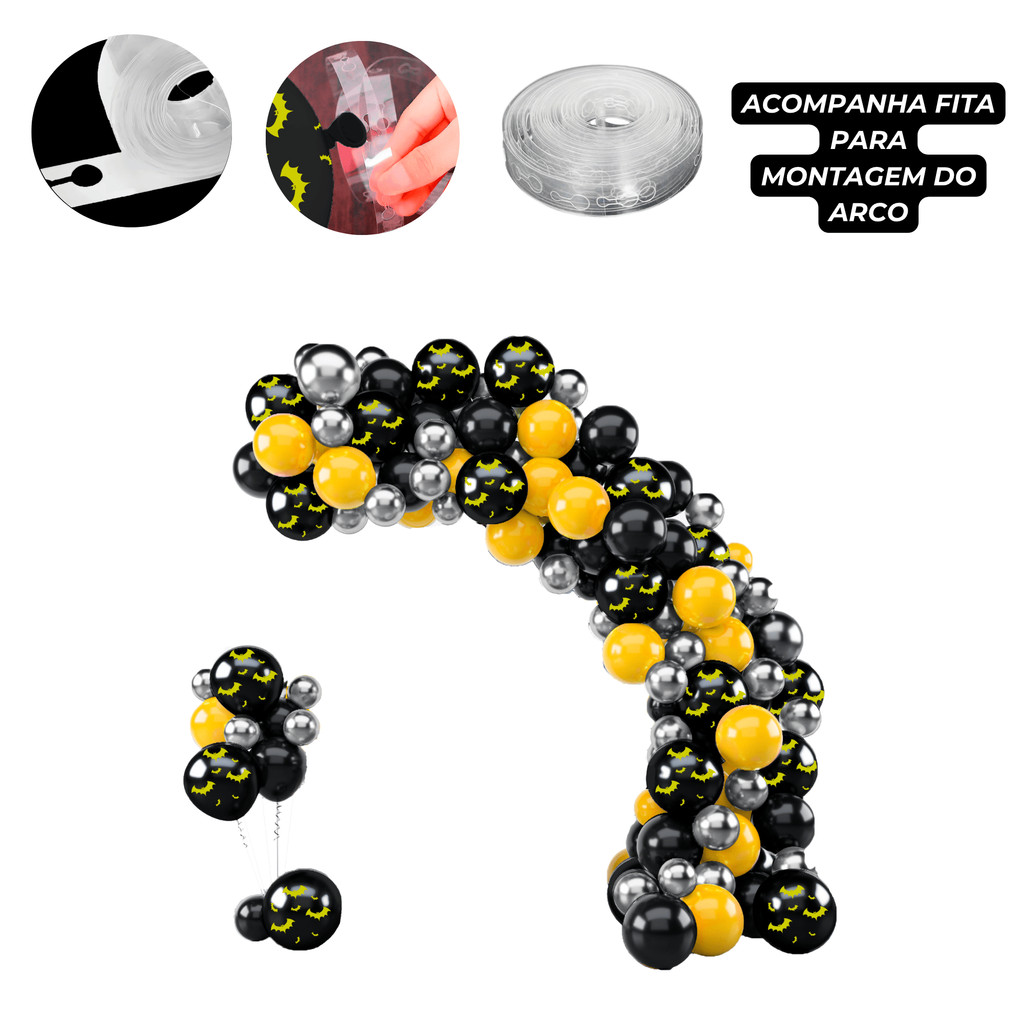 Kit 150 Balões Festa Batman + Fita Arco - Balão Bexiga Liso/Cromado Para Aniversários