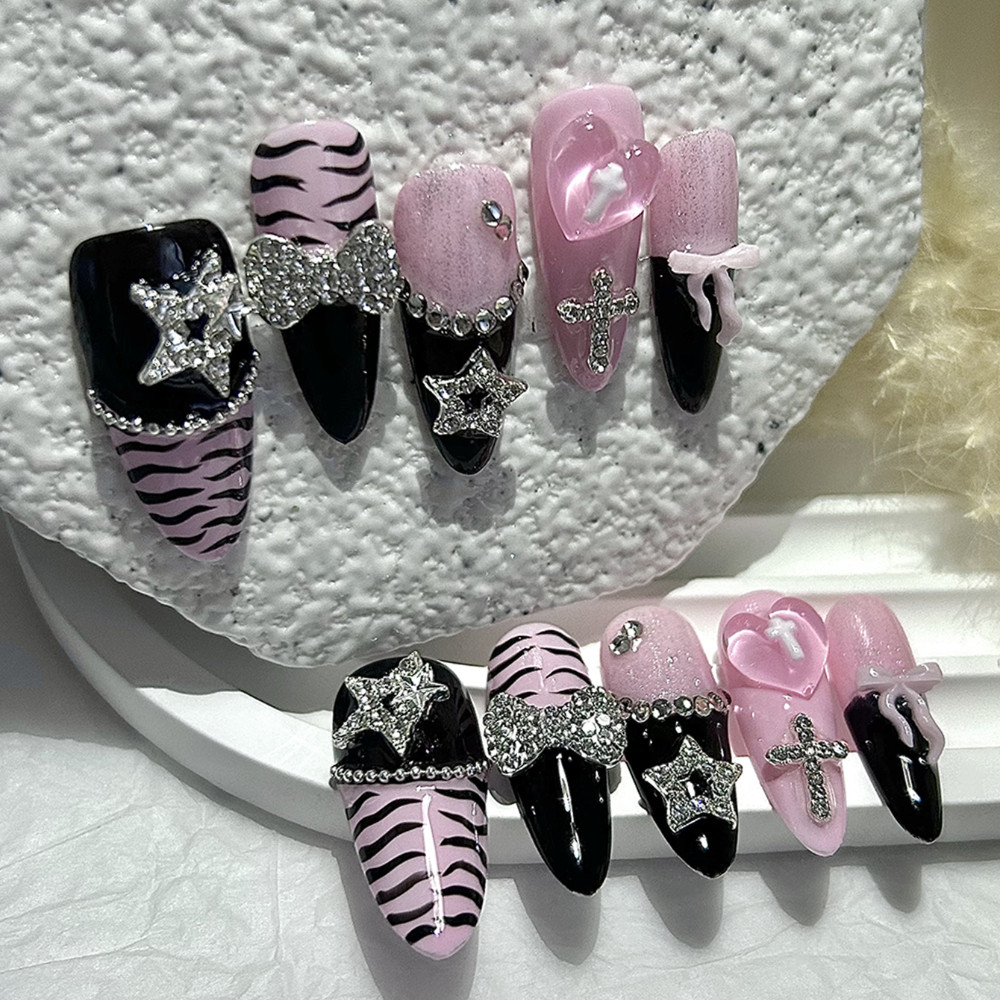 Y2K Baddie Gyaru Preto Rosa Ponta Longa Prensa Francesa Em Unhas Doce Legal Escuro Jirai Nail Art 3D Arco Estrela Cruz A
