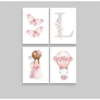 Quadro de decoração -quarto de menina - rosa - letra personalizavel - letra L - borboleta - 4 peças