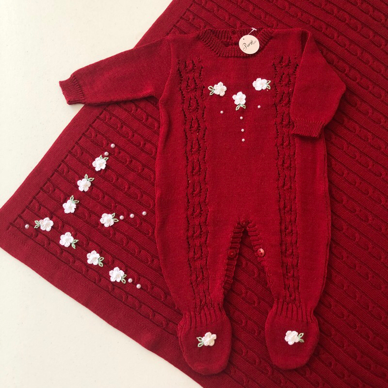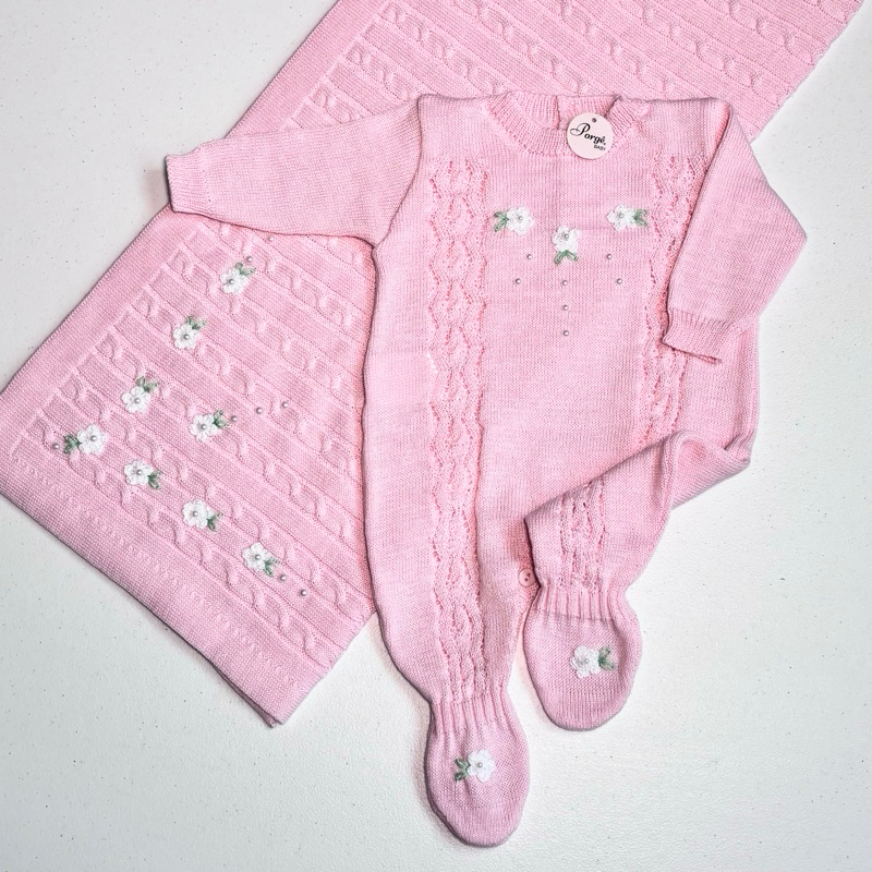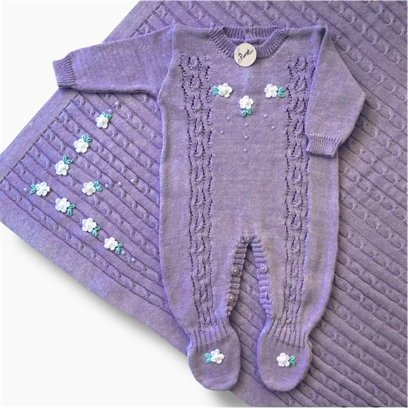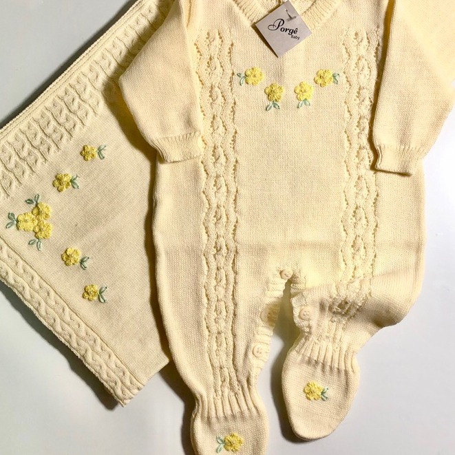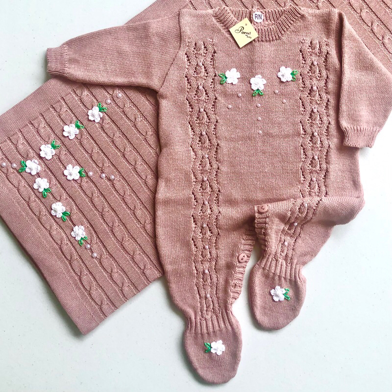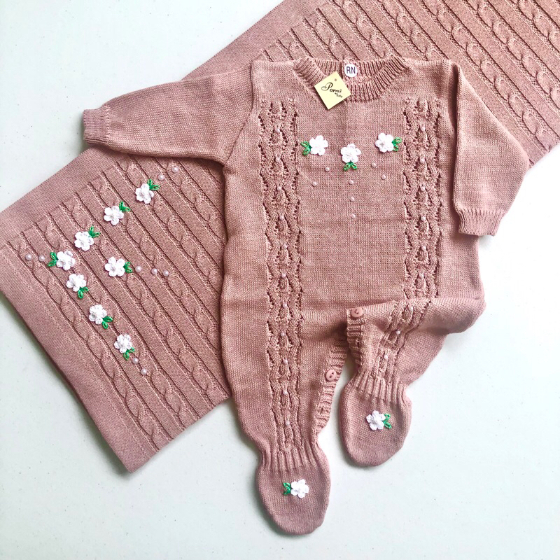 Saída Maternidade Menina Bordada - Macacão Manga Longa e Manta Tricô Opcional - Enxoval Bebê Menina
