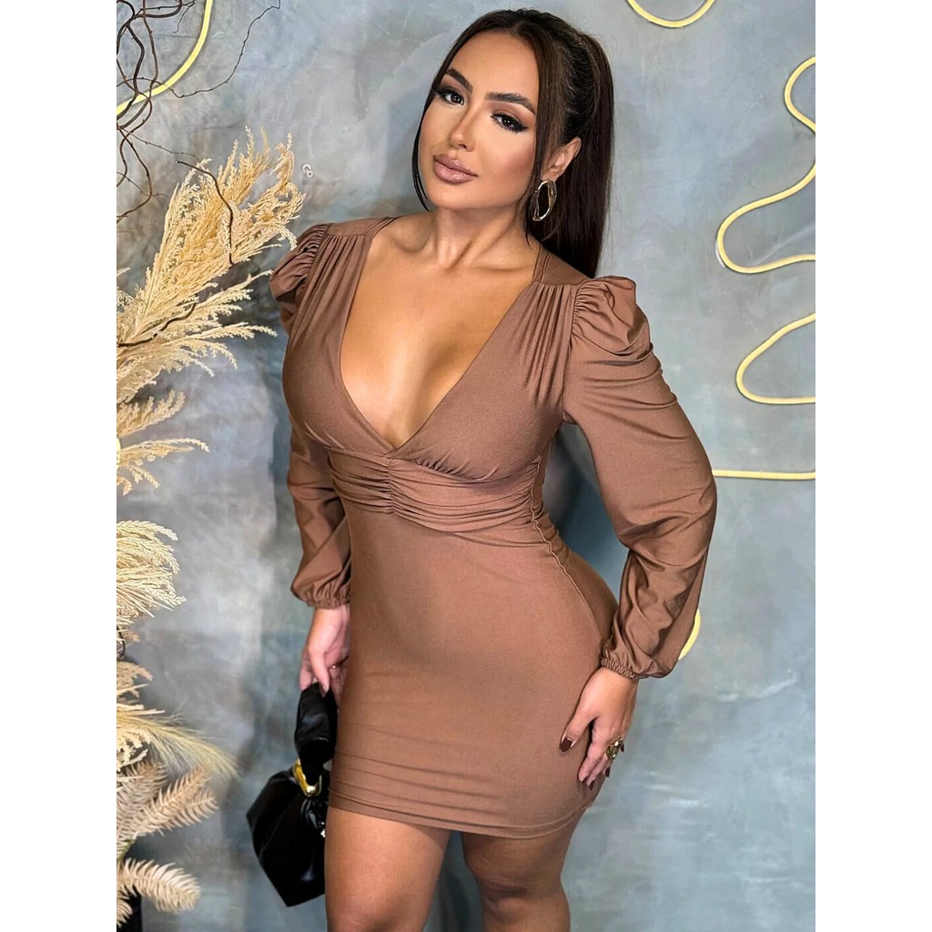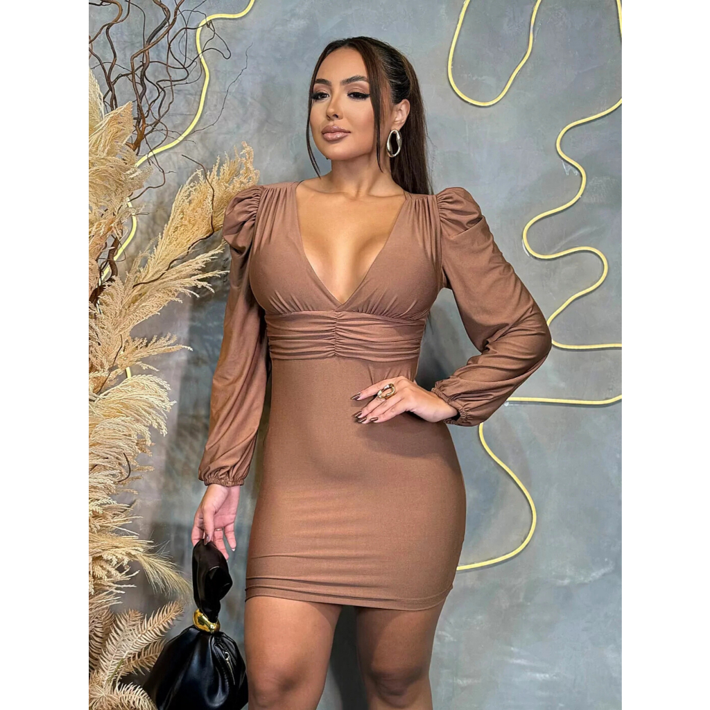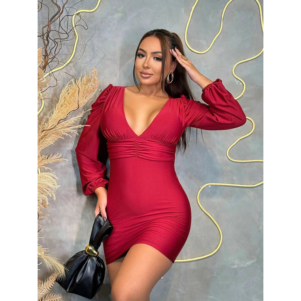 Vestido Feminino Em Malha Suplex Manga Longa Bufante Decotado Franzido Balada Noite