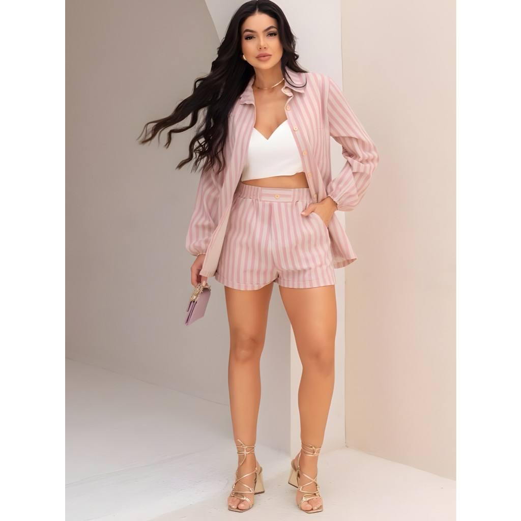 Conjunto Linho Listrado manga longa Camisa botões e short casual, colarinho inverno frio blazer Pastel