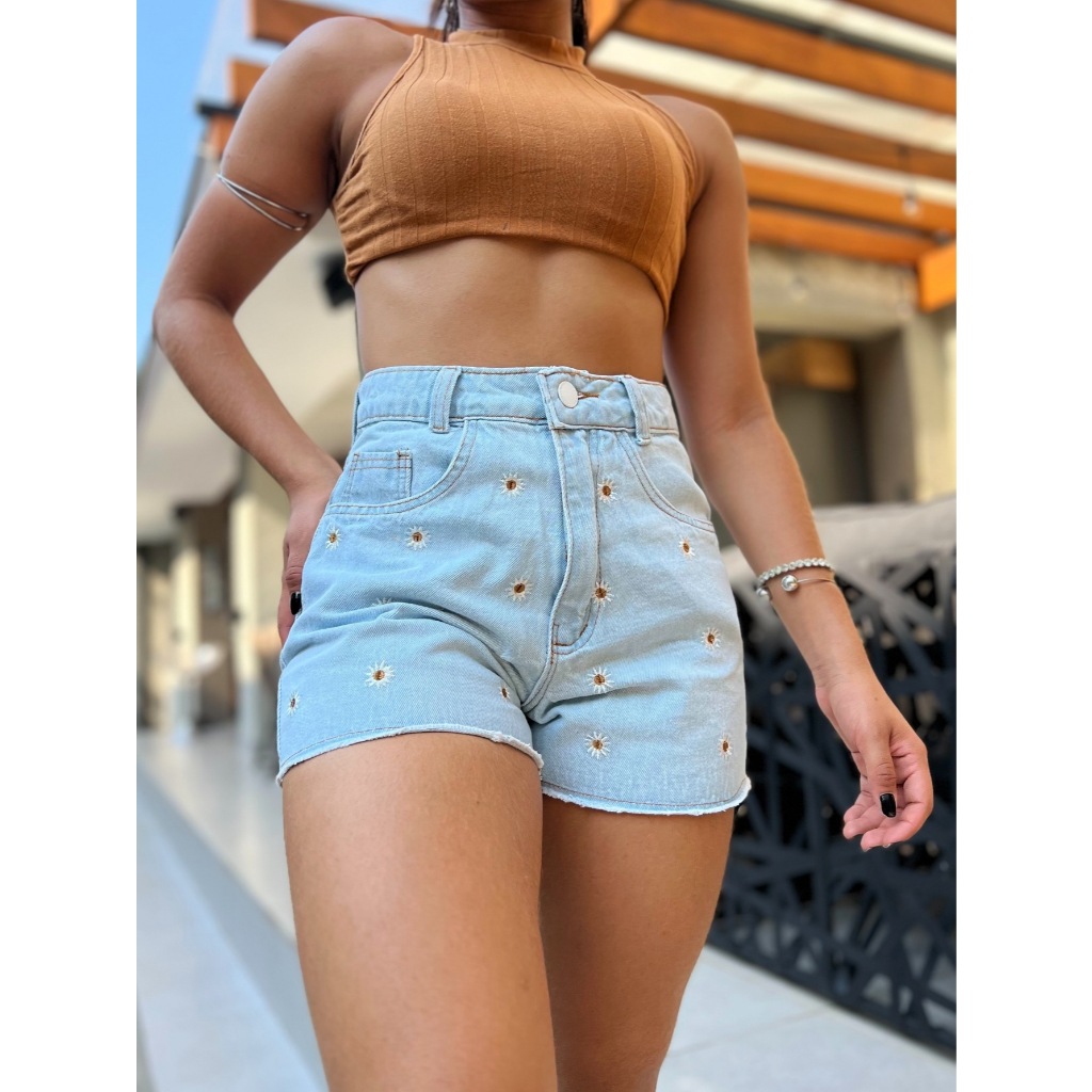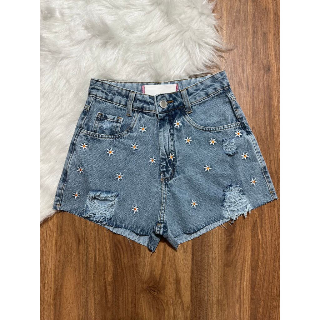 Short Jeans Com Bordado Flor Cintura Alta Botõe encapado Femininas
