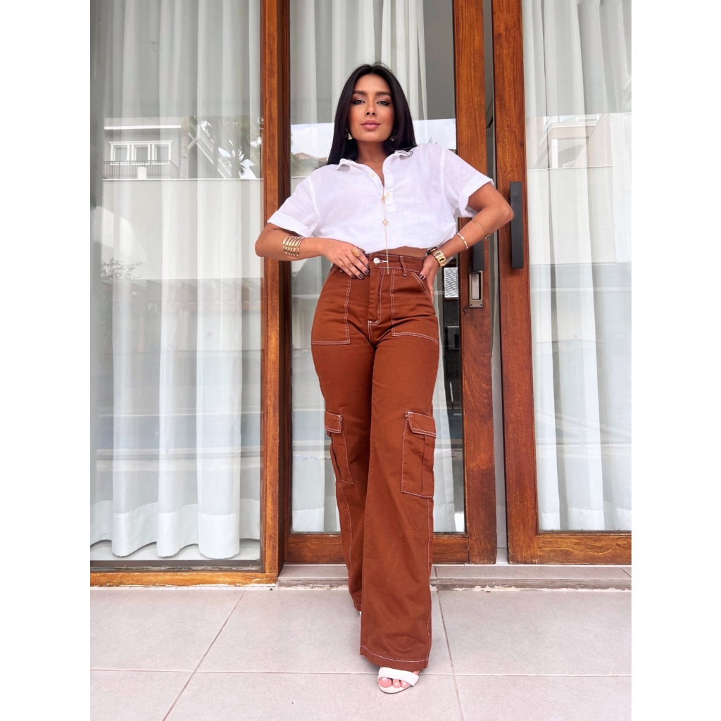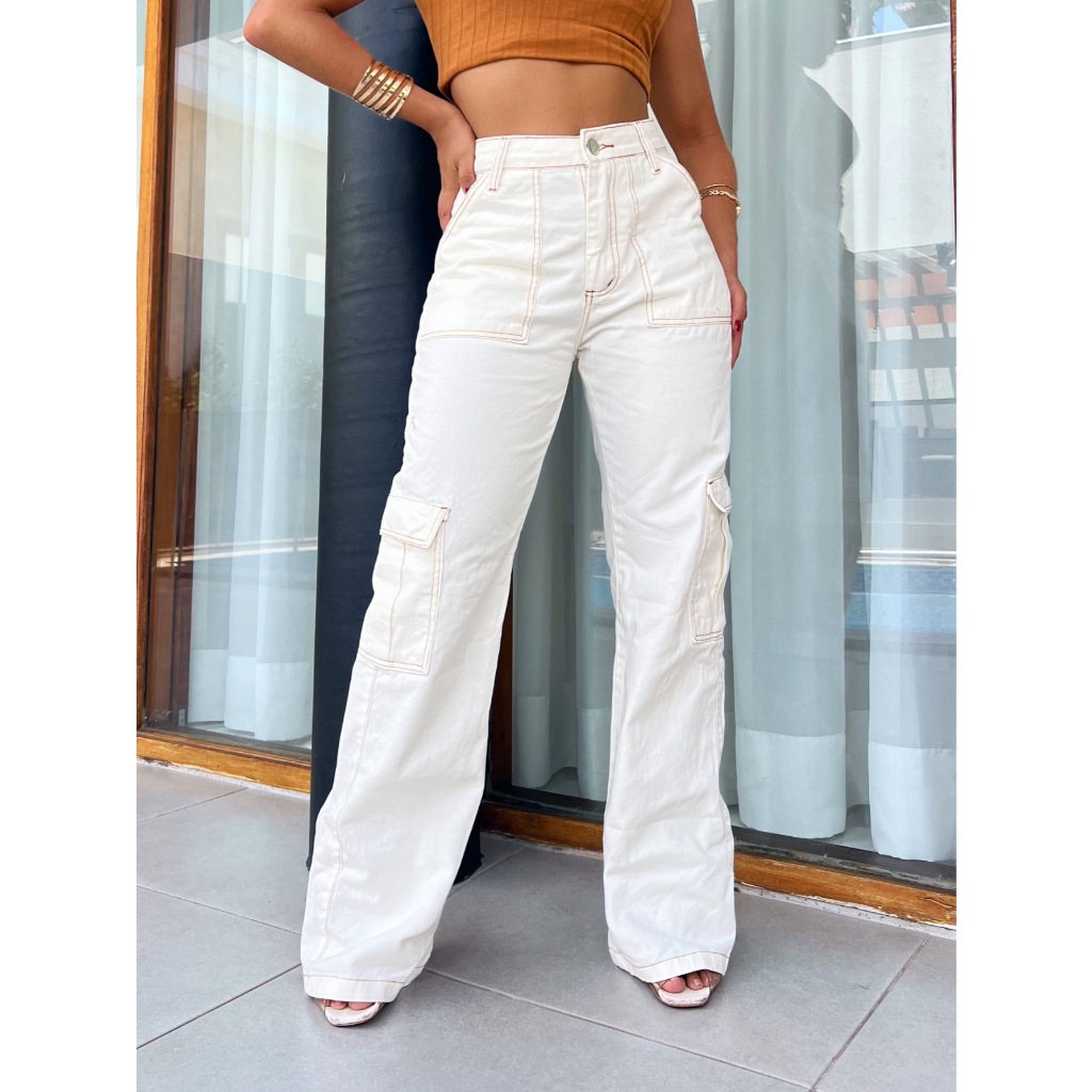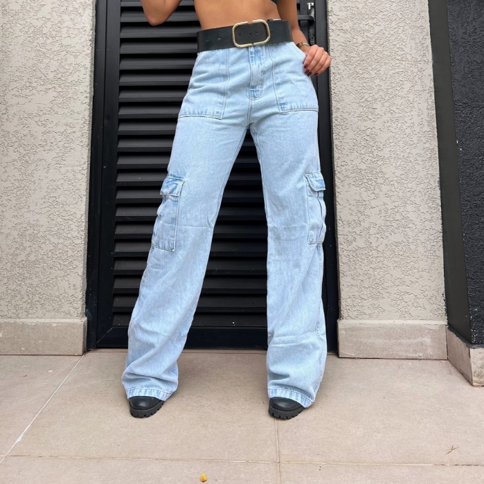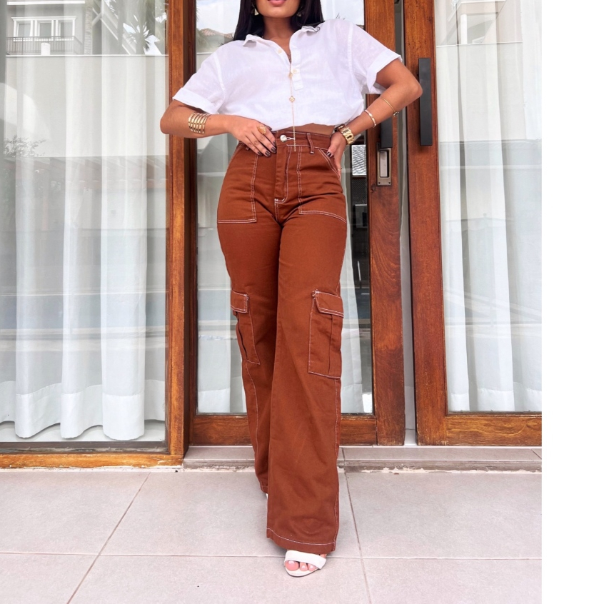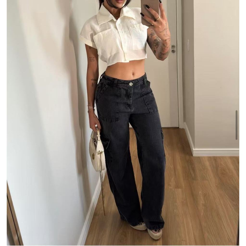 Calça Jeans Calça Cargo wide leg Feminina Moda Street Tecido Algodão Premium