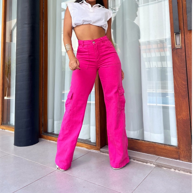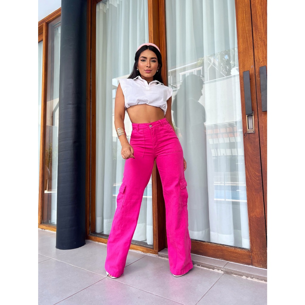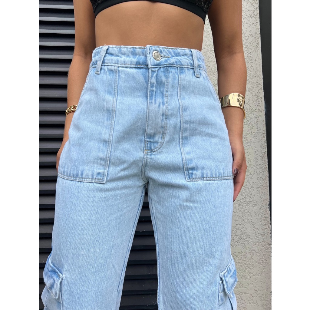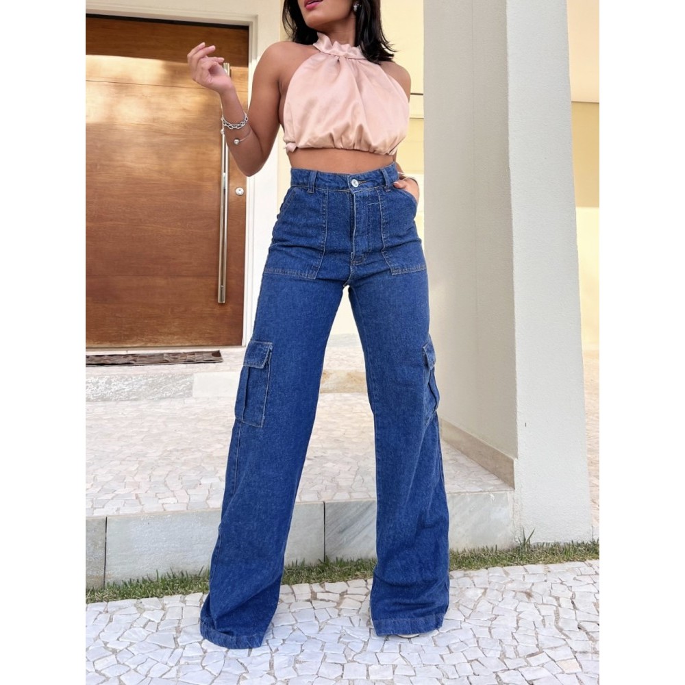 Calça Jeans Calça Cargo wide leg Feminina Moda Street Tecido Algodão Premium