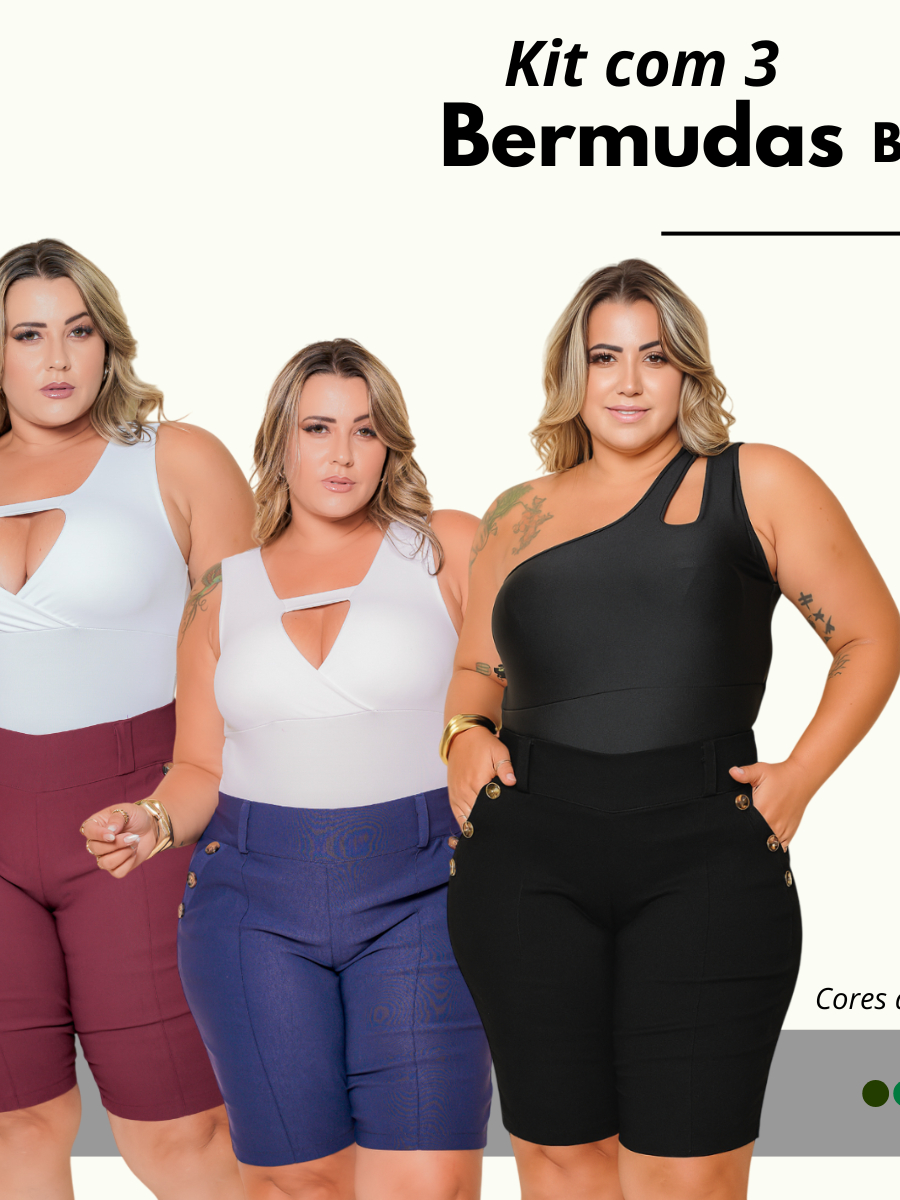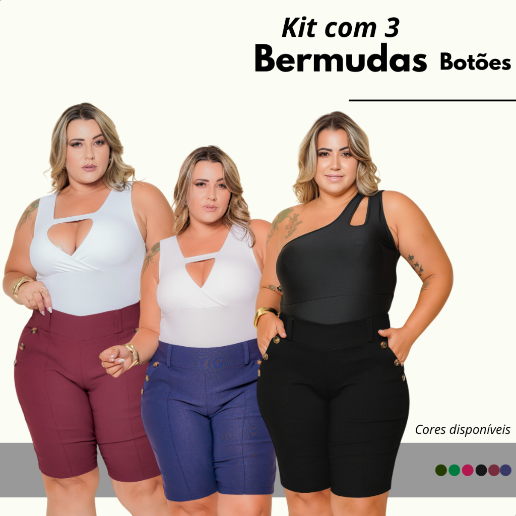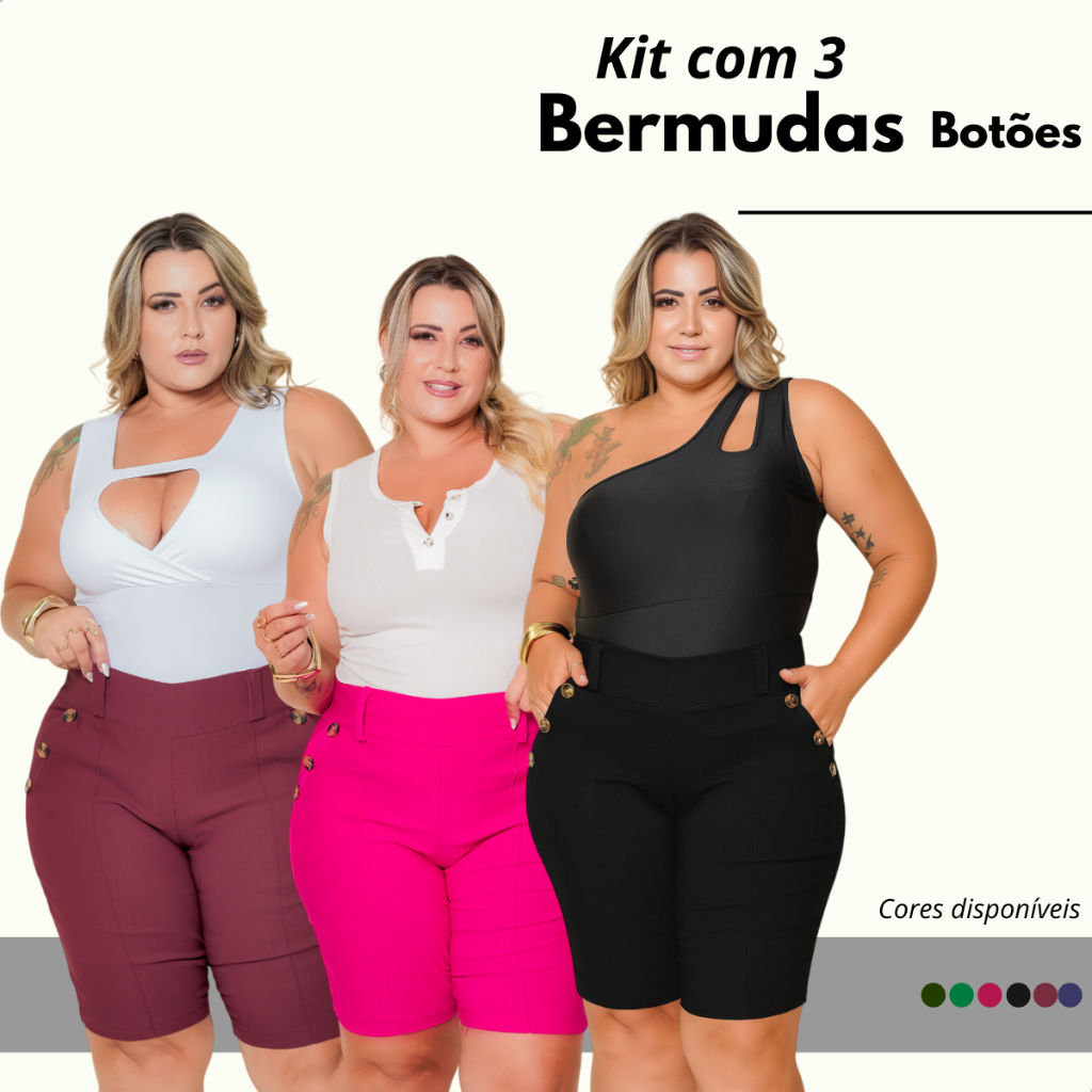 Kit 3 Bermudas Femininas Plus Size Botões Nas Laterais Modelo Grande Estica / Veste 44 até 52
