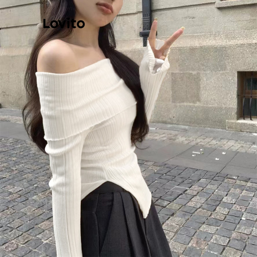 Lovito Blusa Casual Lisa Com Divisão Frontal E Ombro Frio Para Mulheres LNA30014 (Multicolorido)