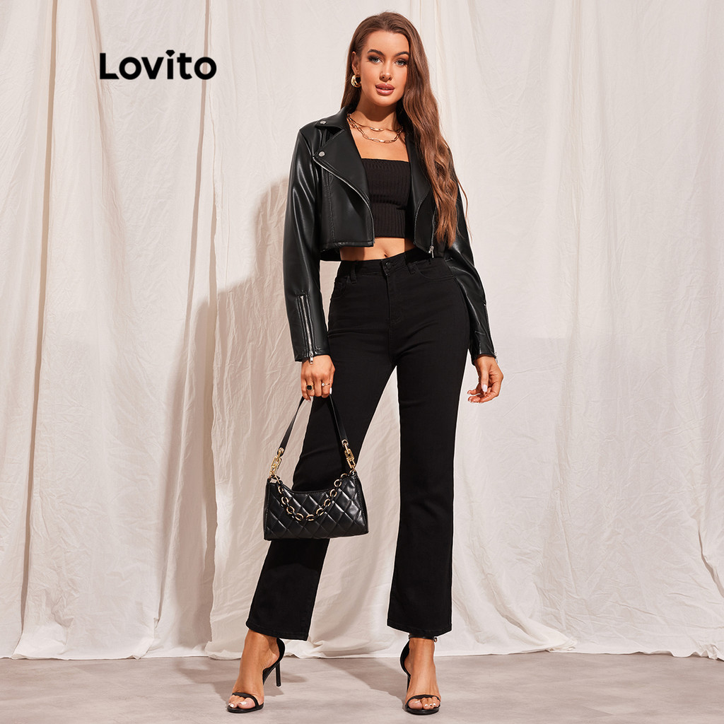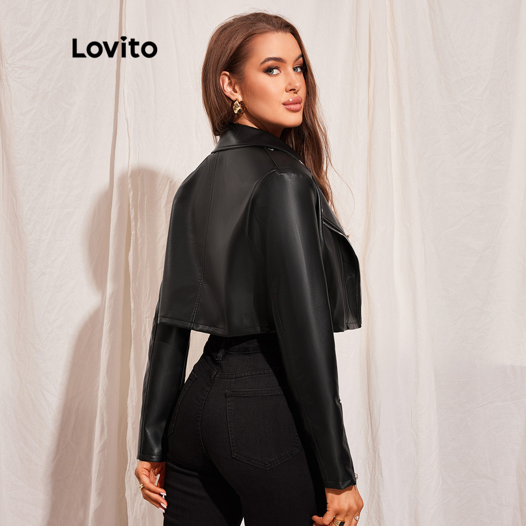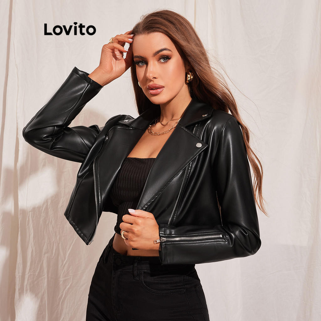 Lovito Casual Jaqueta Feminina Moto Lisa De Couro PU Com Zíper Gola De Lapela L45LD008 (Preta)