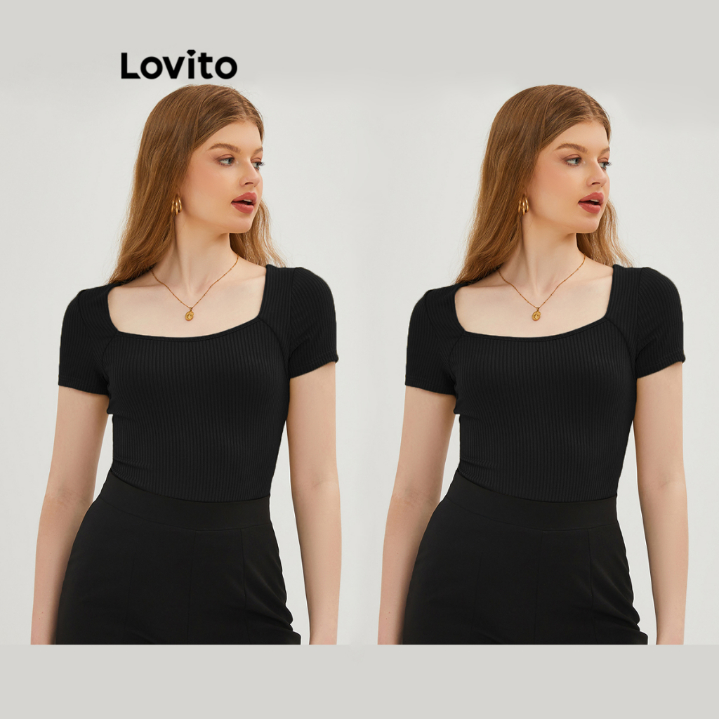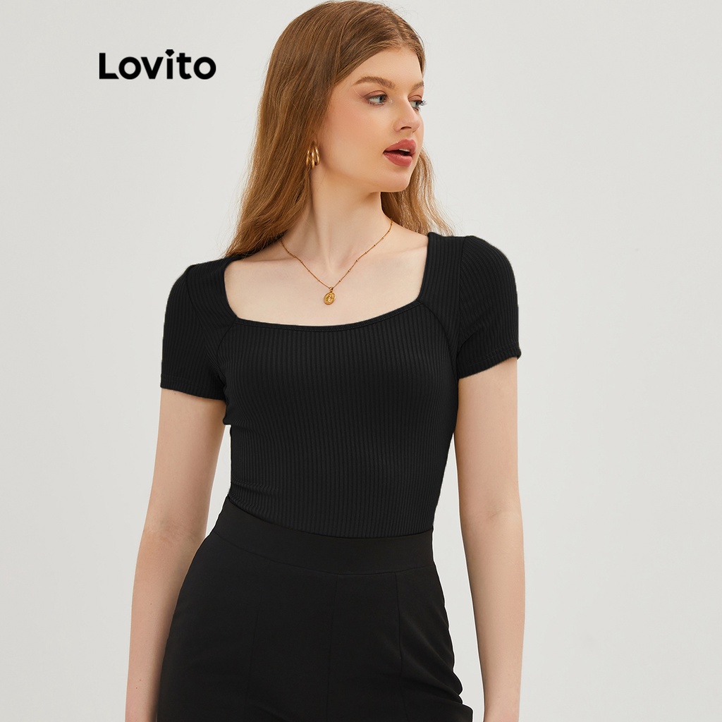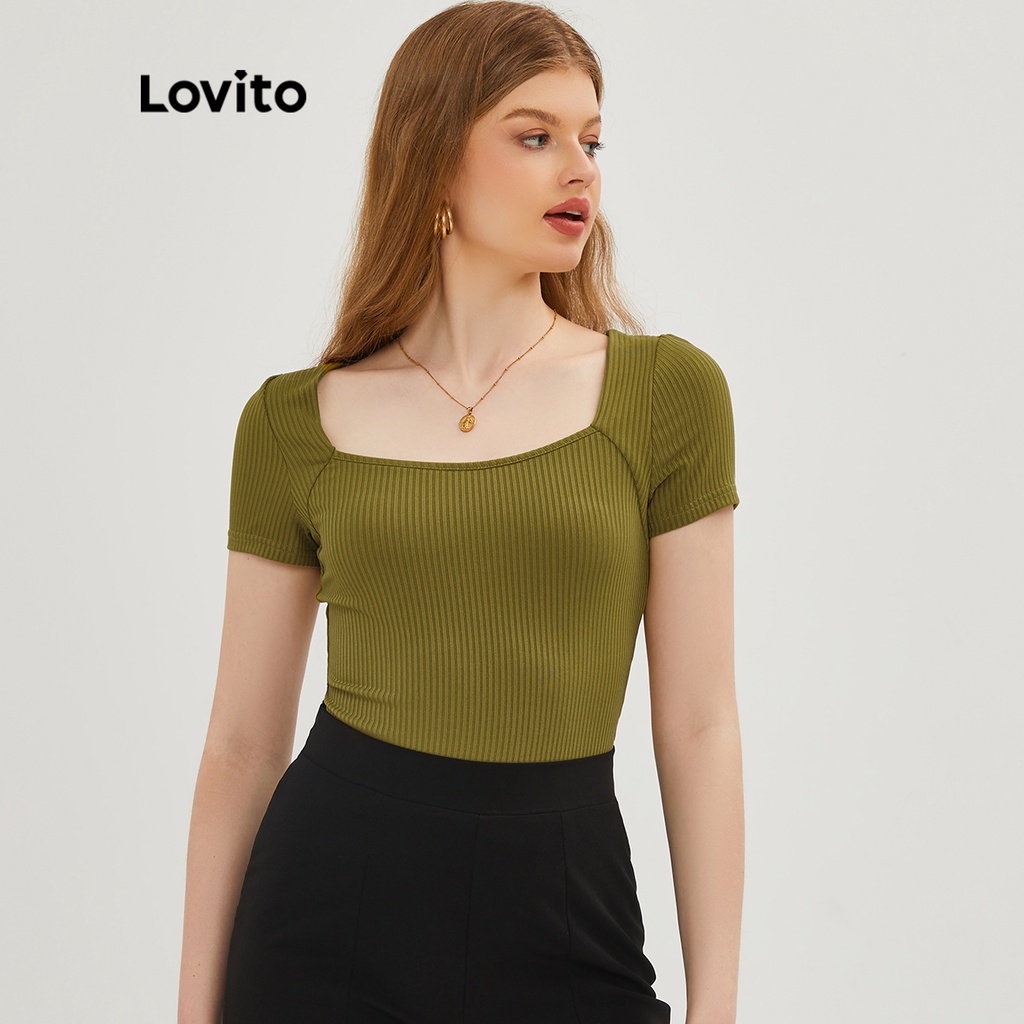 Lovito Camiseta Vintage Lisa Com Gola Quadrada E Malha Canelada Para Mulheres L20D243 (Verde/Preto)
