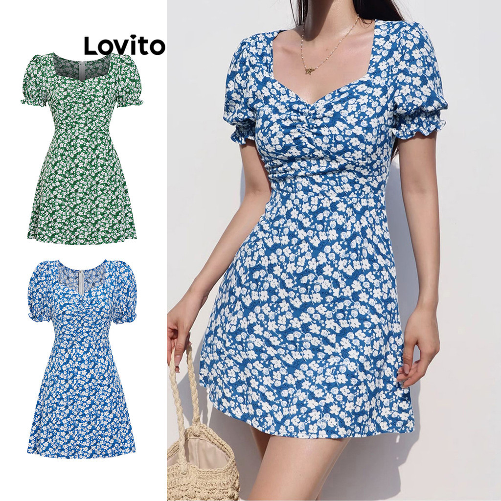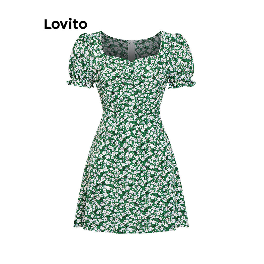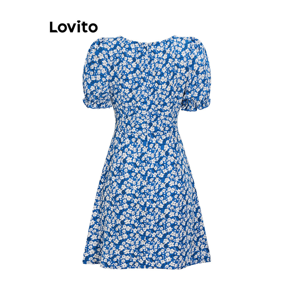 Lovito Vestido Casual Ditsy Floral Plissado Manga Bufante Para Mulheres L62ED140 (Multicolorido)