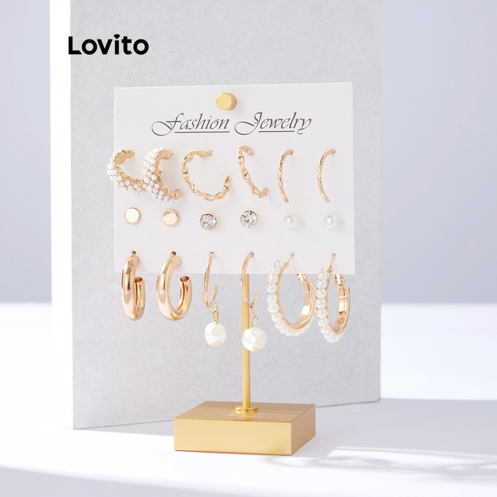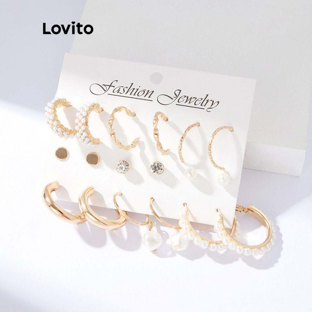 Lovito 9 Pçs Brinco de Metal Elegante com Glitter e Pérolas Pom Pom de Metal L34AD068 (Dourado)