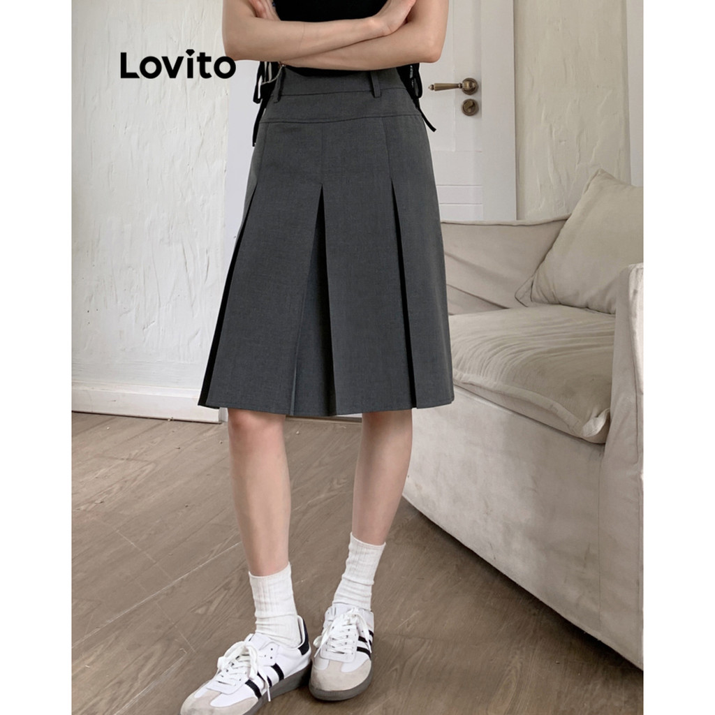 Lovito Saias Casuais Saias Básicas Plissadas Lisas Para Mulheres LNE29157 (Cinza)