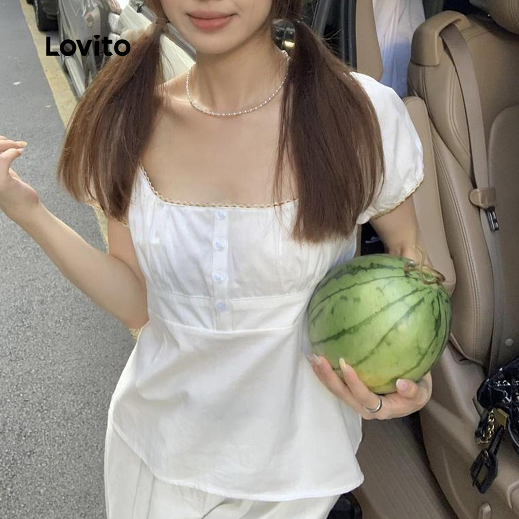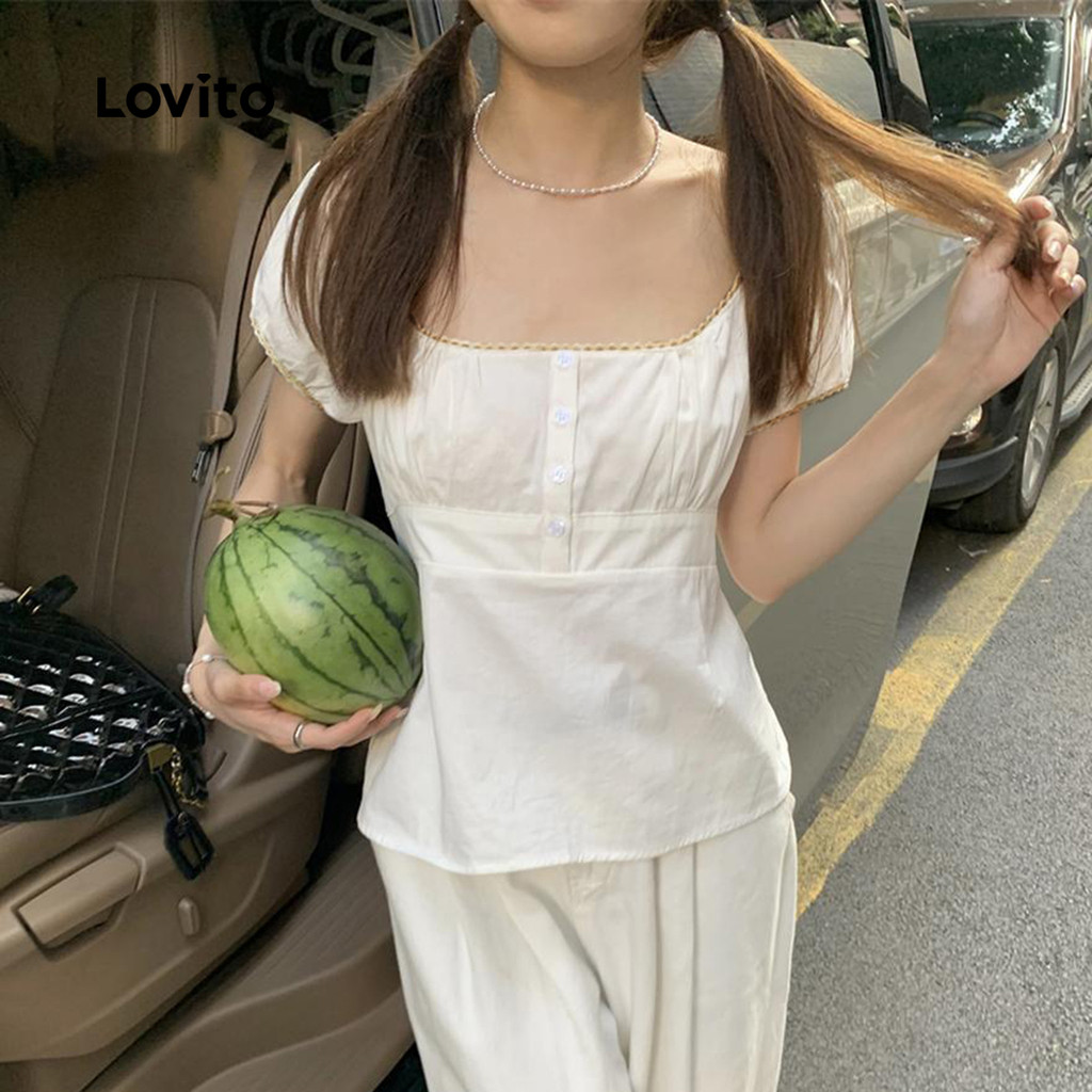 Lovito Blusa Casual Verão Botão Frente Renda Blusa Plissada Para Mulheres LNE38334 (Branco)