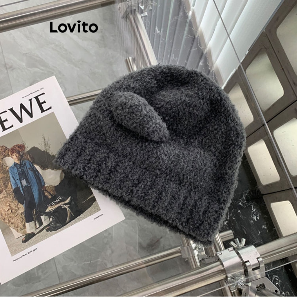 Lovito Fofo Chapéu Feminino de Desenho com Orelhas de Urso de Pelúcia Quente LFA08595 (Cinza/Branco/Preto)