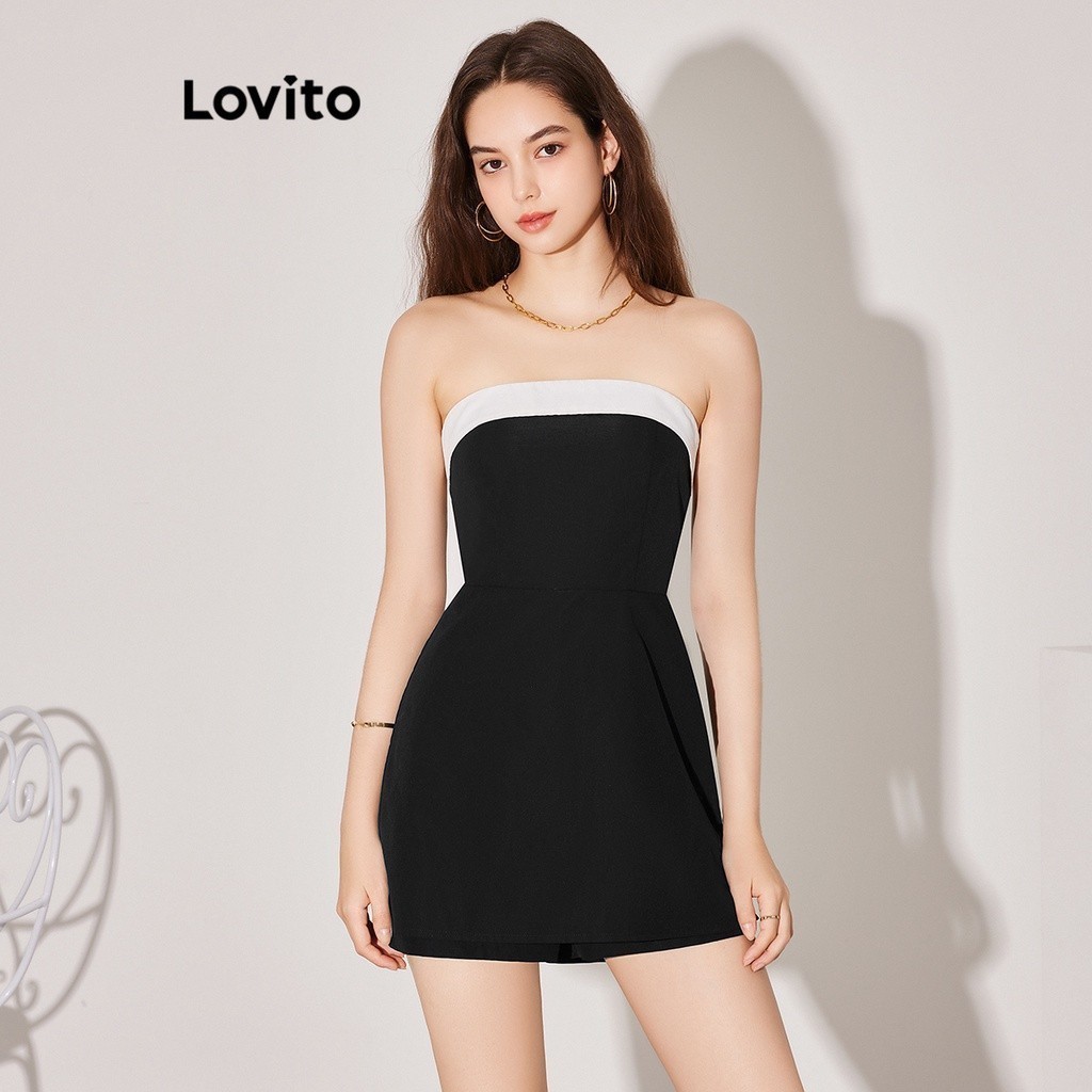 Lovito Macacão Formal Liso Colorblock Assimétrico Para Mulheres L59ED157 (Preto)