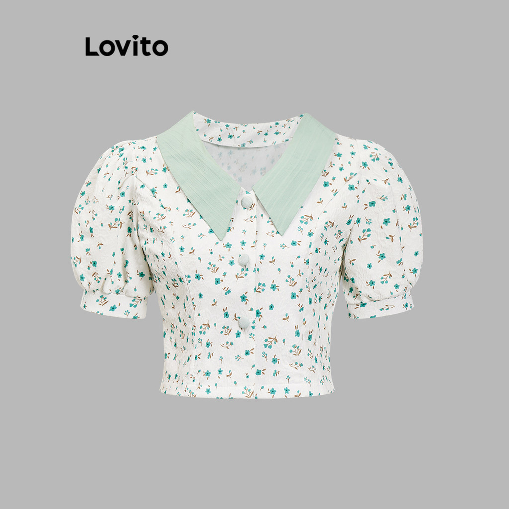 Lovito Blusa com Gola Contrastante e Mangas Bufantes com Estampa Floral para Mulheres LNA16038 (Multicolorido)
