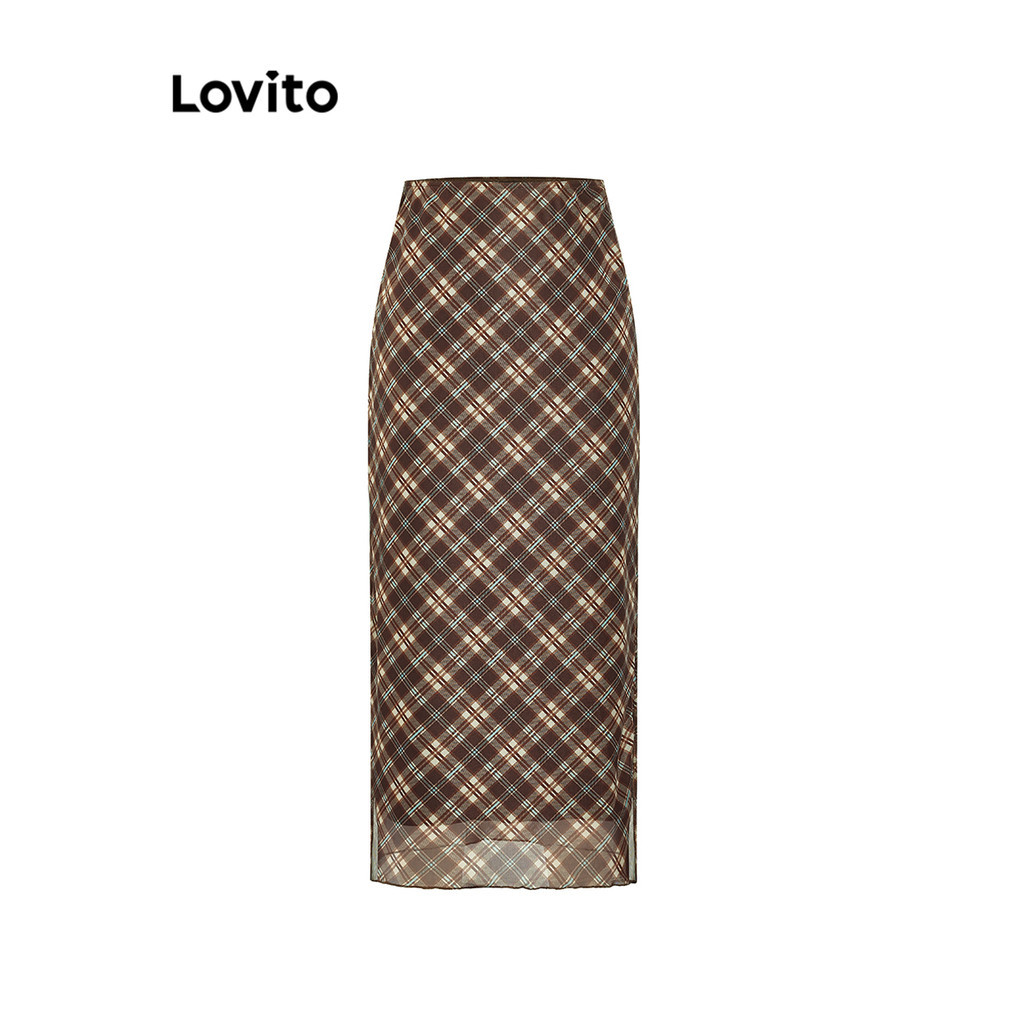 Lovito Saias Formais Xadrez Saias Divididas De Camada Dupla Para Mulheres L58AD073 (Multicolorido)