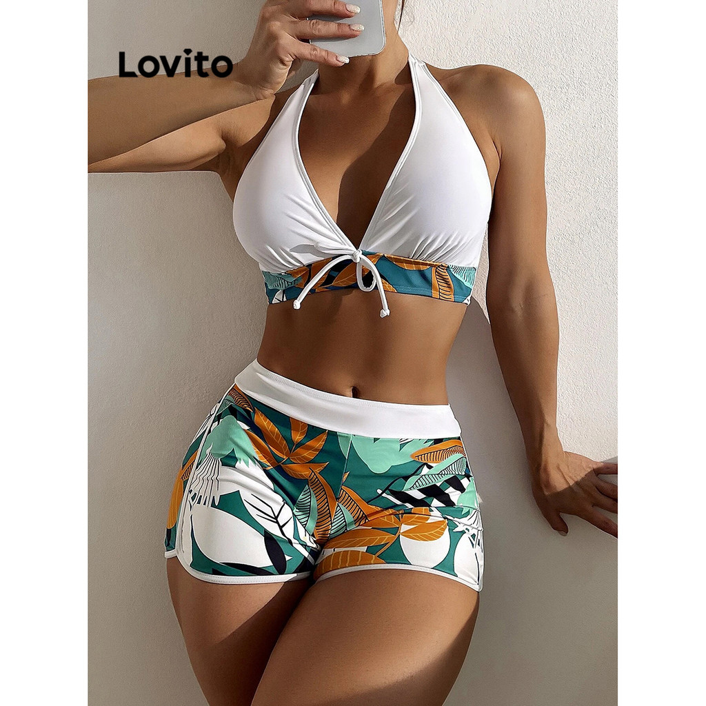 Lovito Conjuntos De Biquíni Sexy Plantas Arco Conjuntos De Biquíni De Verão Para Mulheres LNL36108 (Branco/Verde/Preto)
