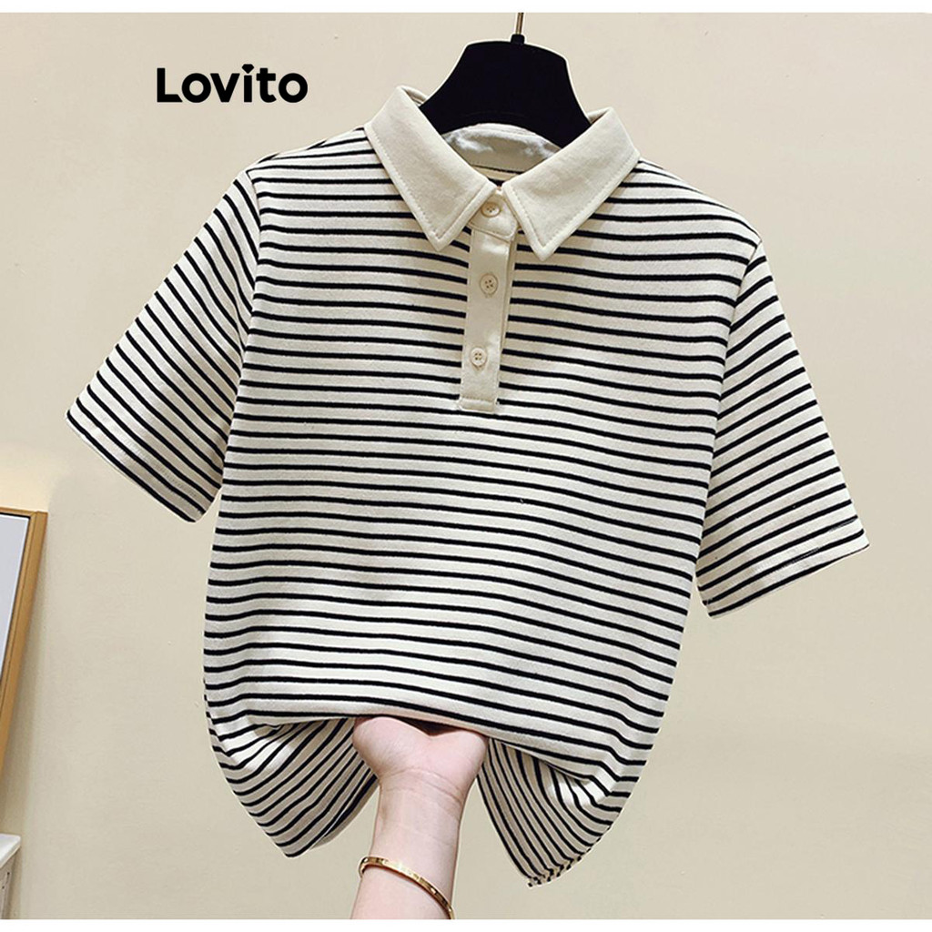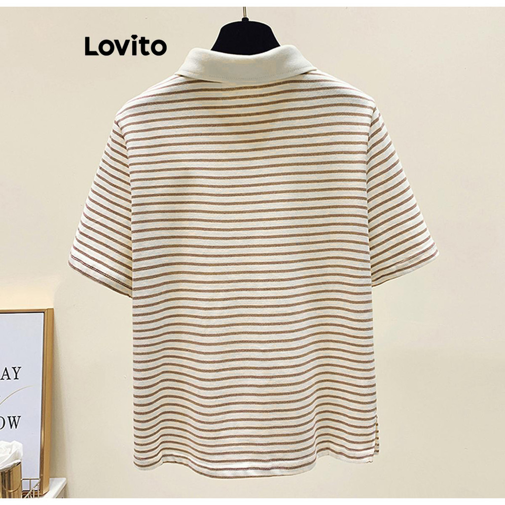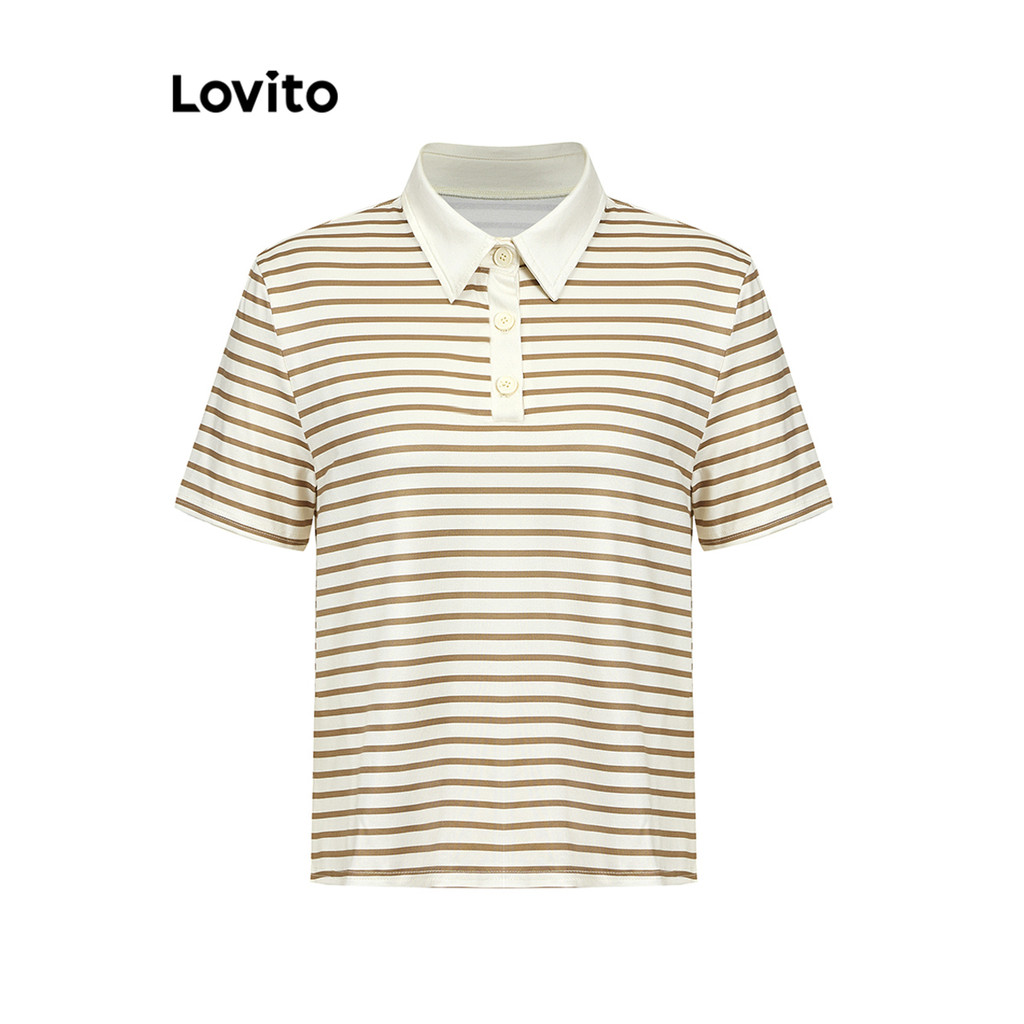 Lovito Camiseta Casual Listrada Com Botão Frontal E Gola Colorblock Para Mulheres LNE38178 (Café/Preto)