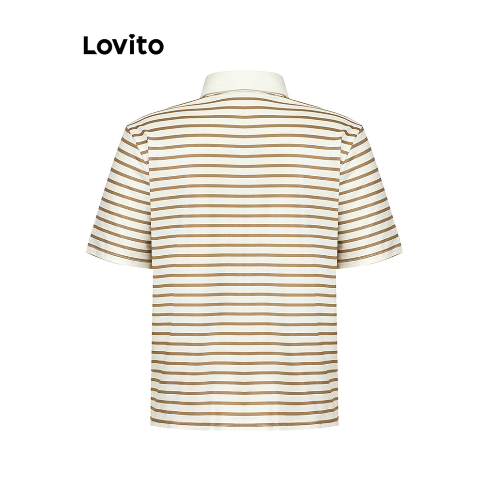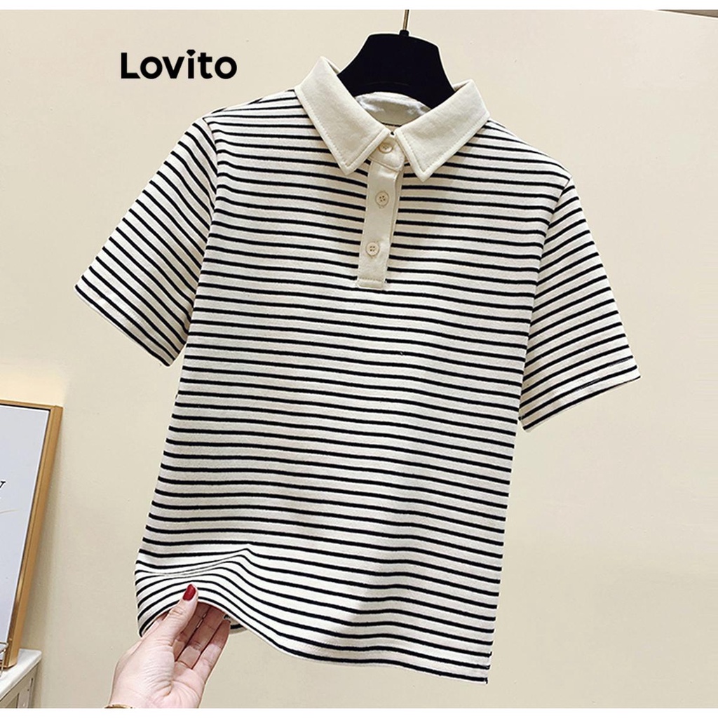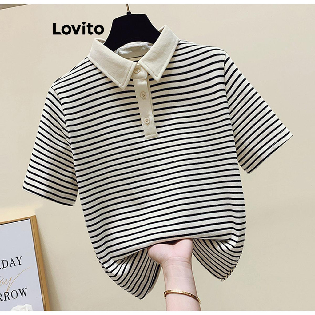 Lovito Camiseta Casual Listrada Com Botão Frontal E Gola Colorblock Para Mulheres LNE38178 (Café/Preto)