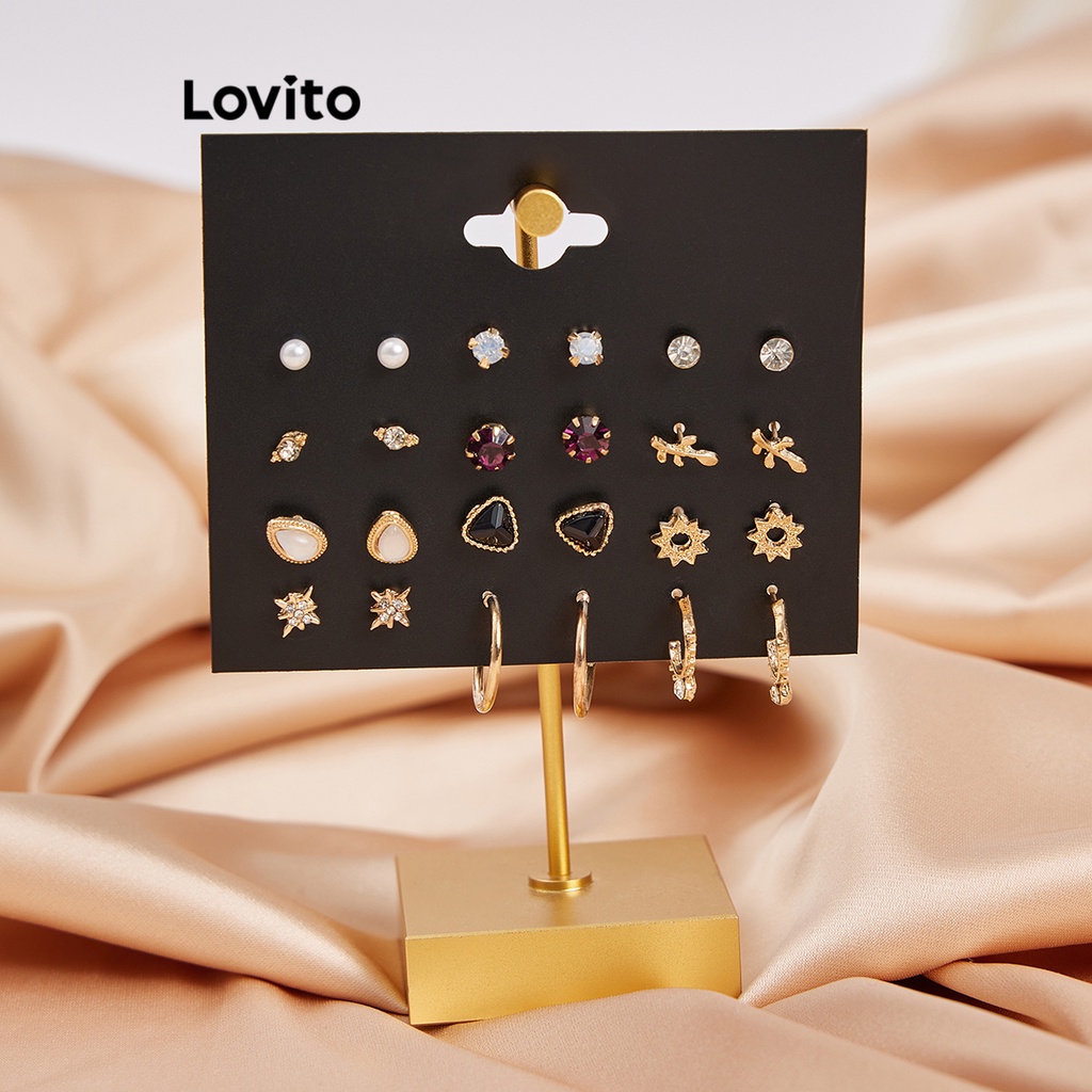 Lovito Brincos Casuais Geométricos Strass Pérolas Brincos De Gota De Água Para Mulheres L60AD025 (Ouro)