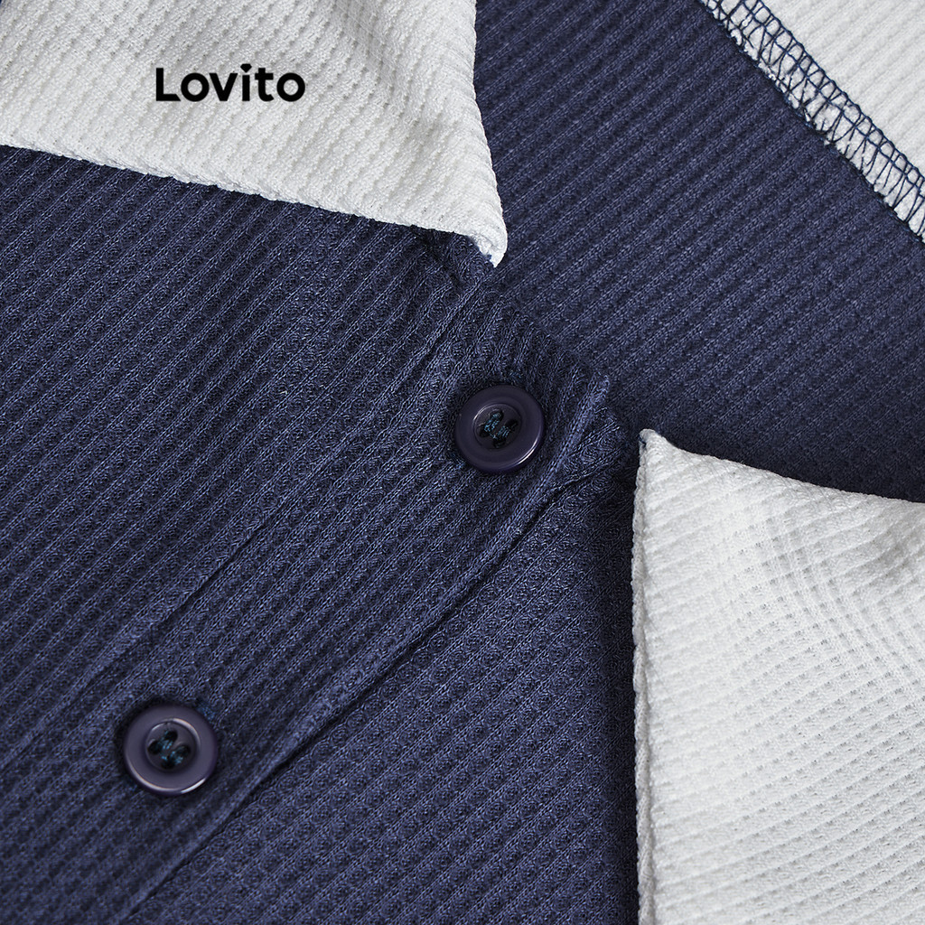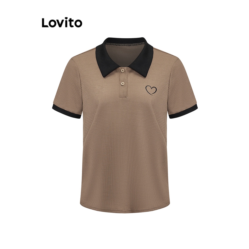 Lovito Casual Camiseta Feminina Polo com Coração Colorblock de Tricô L71ED030 (Cáqui Claro/Azul)