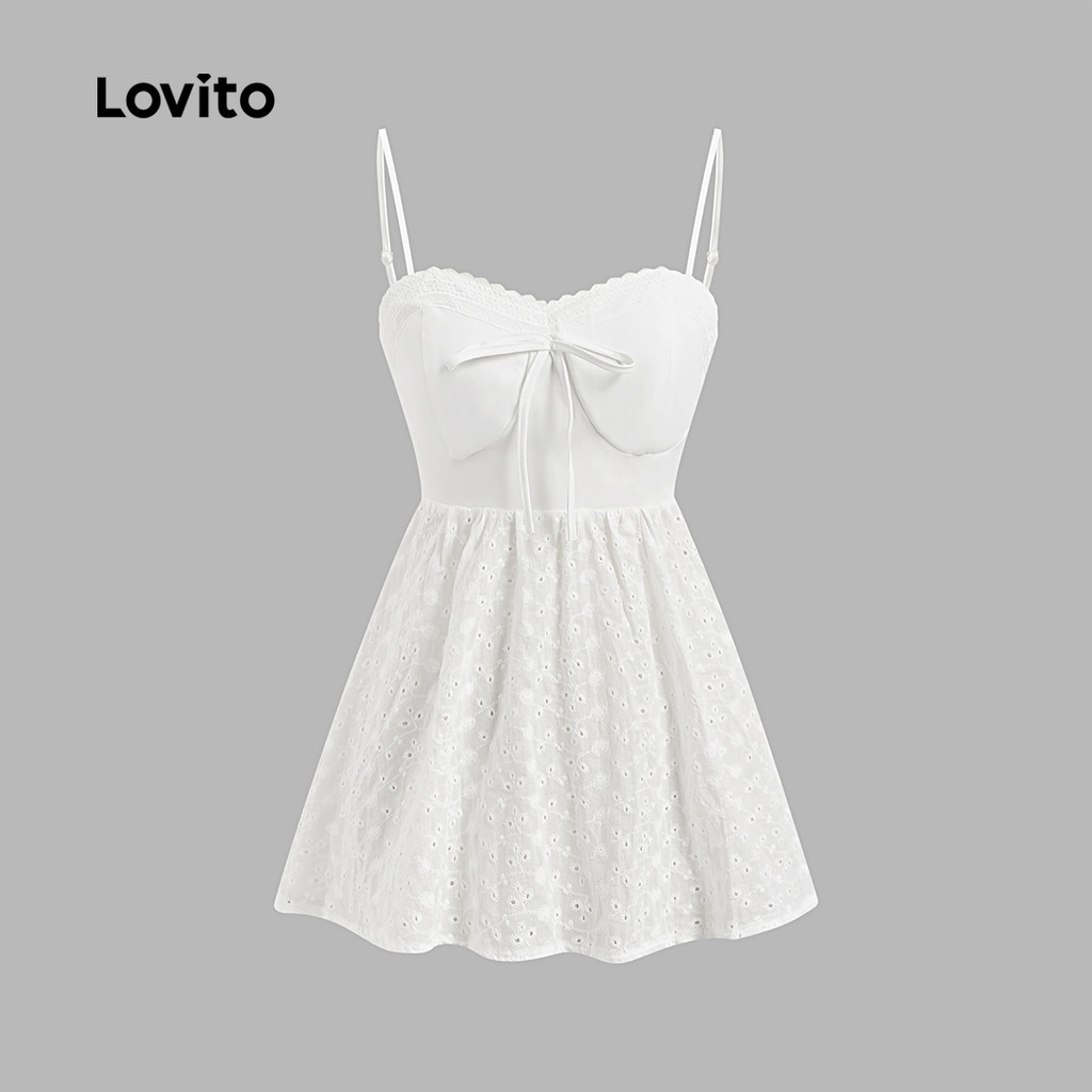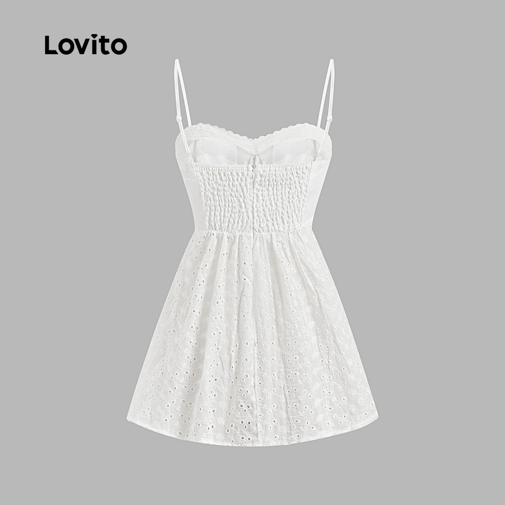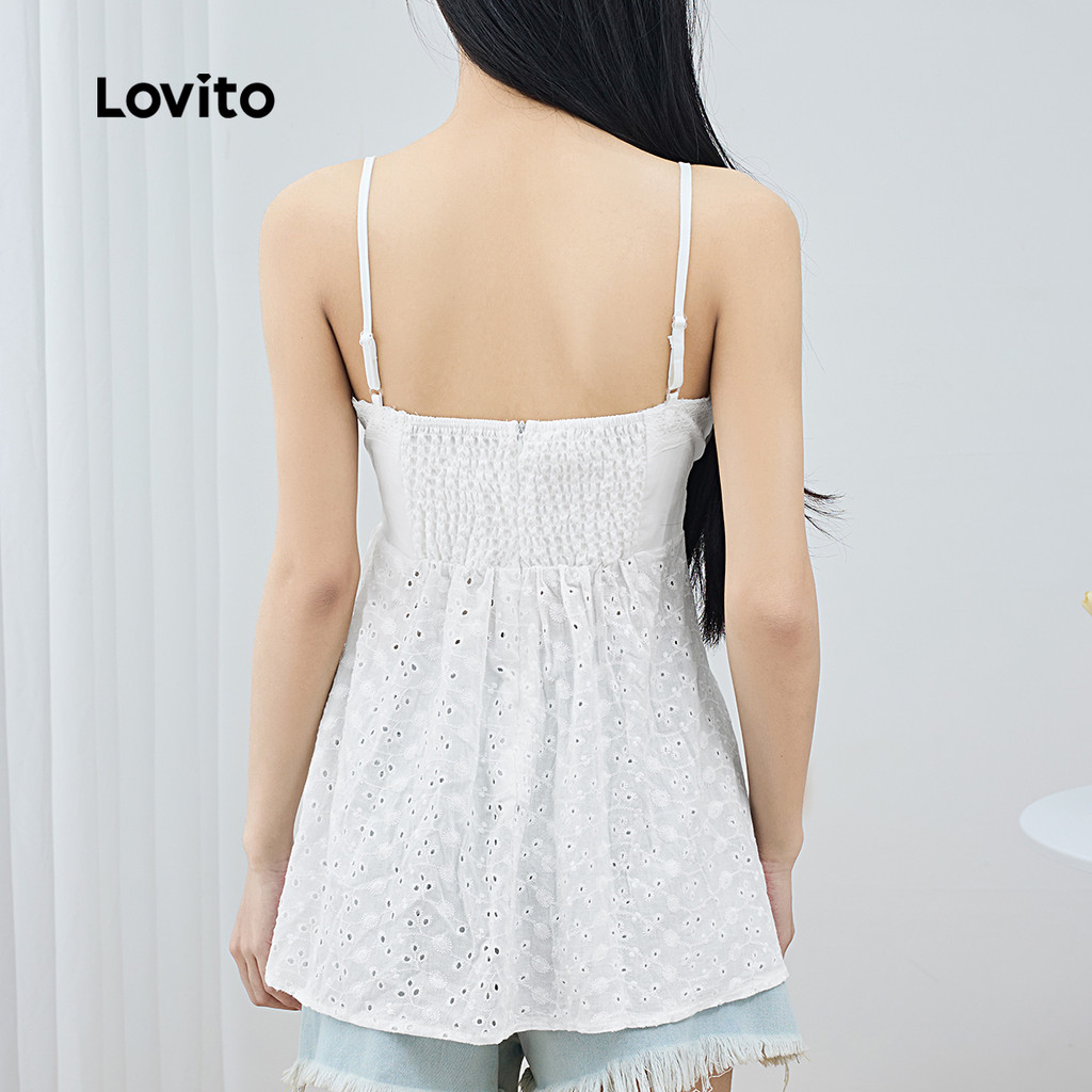 Lovito Regata Casual Com Ilhó Liso Bordado Alface Guarnição Com Cadarço Top Cami Para Mulheres LNE17042 (Branco)