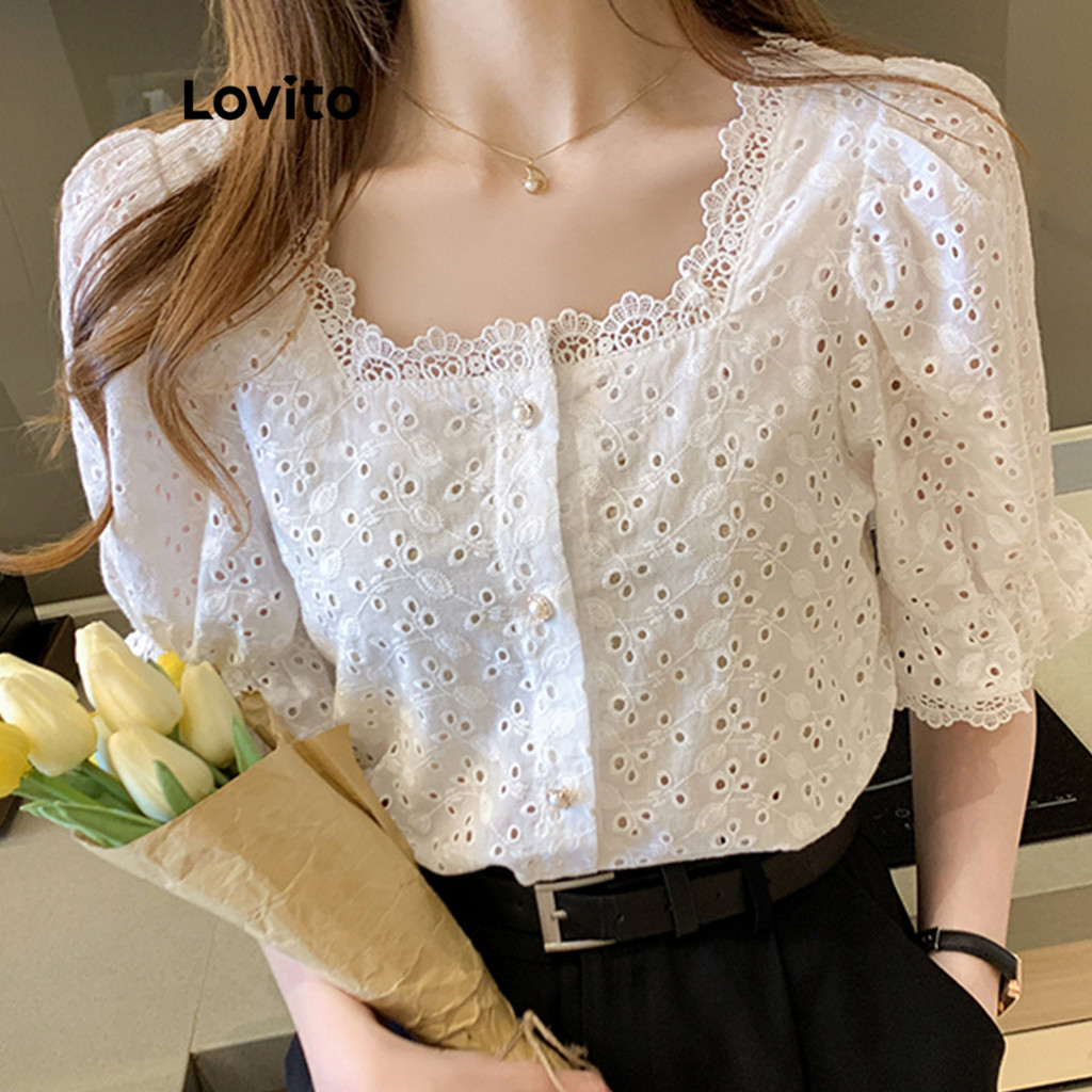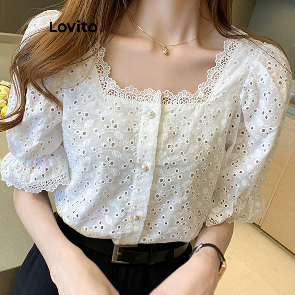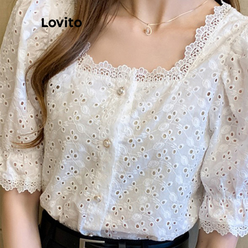 Lovito Blusa Casual Simples Ilhó Bordado Pérola Fivela Contraste Blusas De Renda Para Mulheres LNE16069 (Branco)