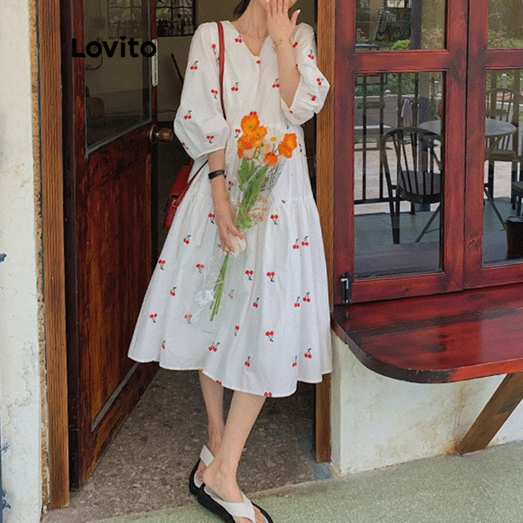 Lovito Vestido Casual Fruta Padrão Decote Em V Manga Curta Vestido Midi Para Mulheres LNA13079 (Branco)