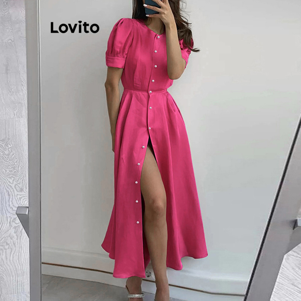 Lovito Vestido Casual Liso Com Botão Dividido Na Frente E Manga Bufante Para Mulheres LNE27187 (Multicolorido)