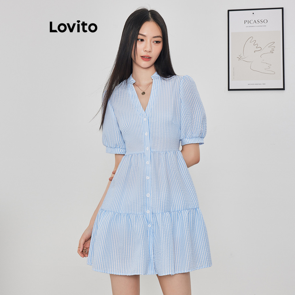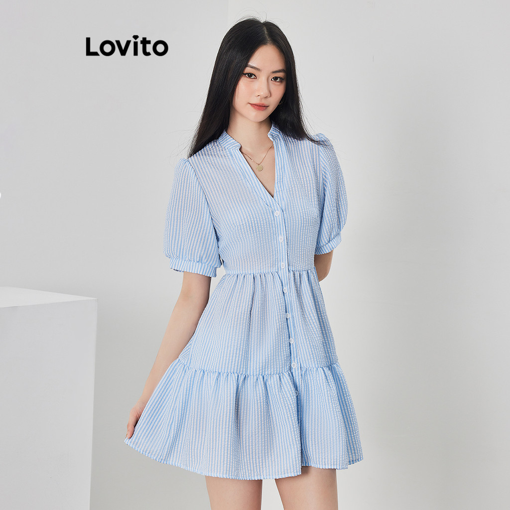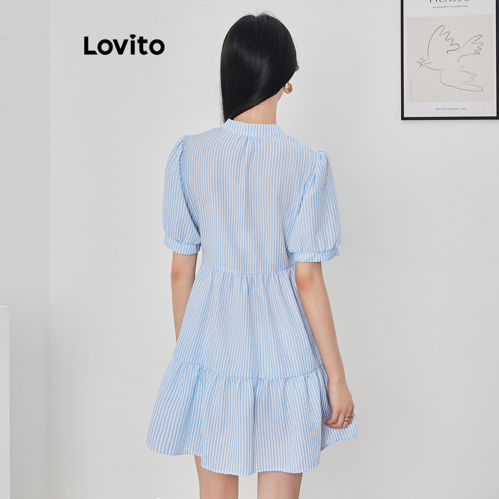Lovito Vestido Casual Listrado Franzido Manga Bufante Para Mulheres L62ED137 (Azul)