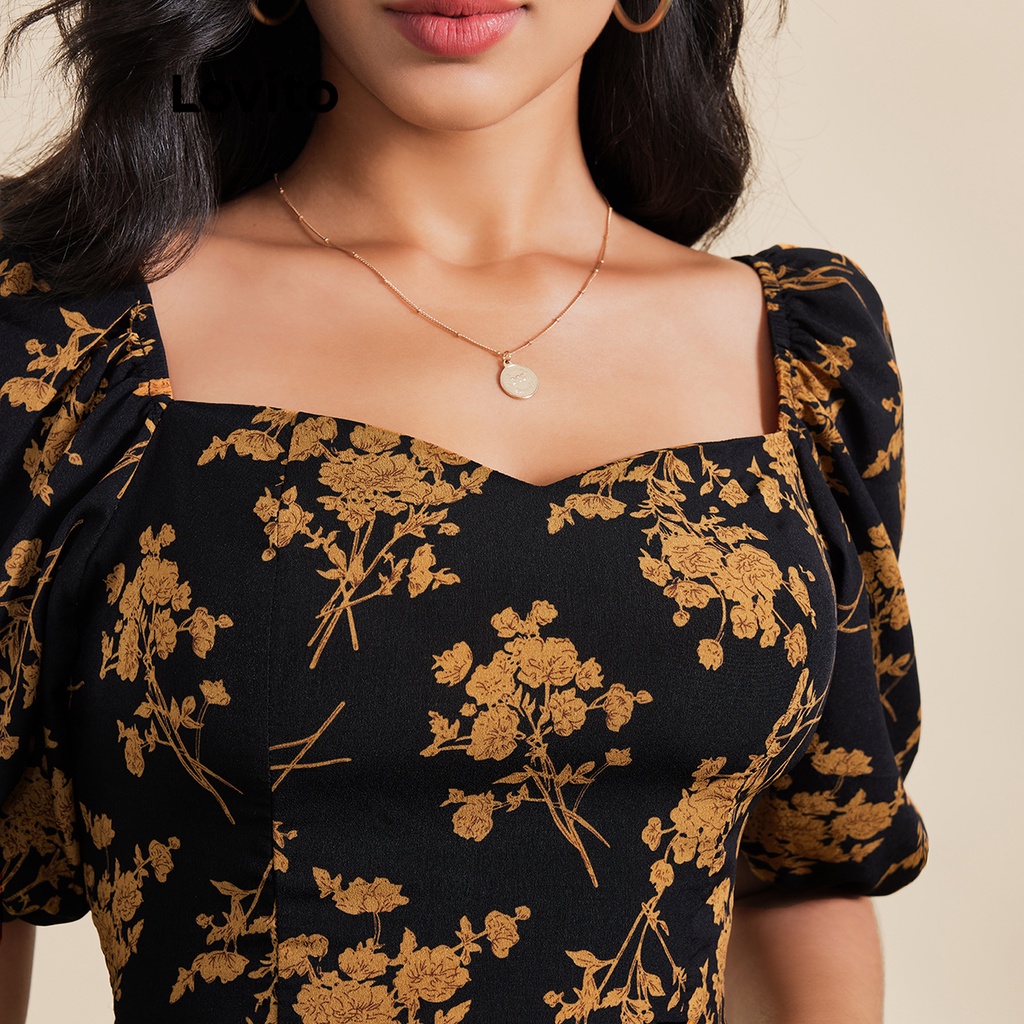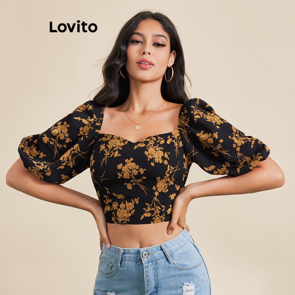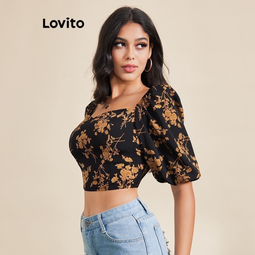Lovito Blusa Casual Ditsy Floral Crop Blusa Para Mulheres LBE03065 (Preto)