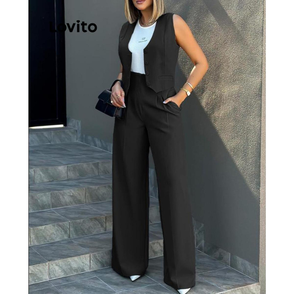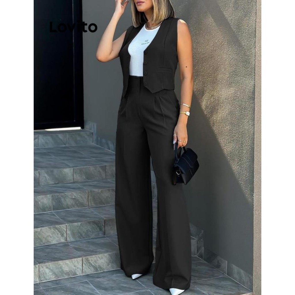 Lovito Conjuntos De Calças Casuais Com Botão Liso E Bolso Frontal Para Mulheres LNL51150