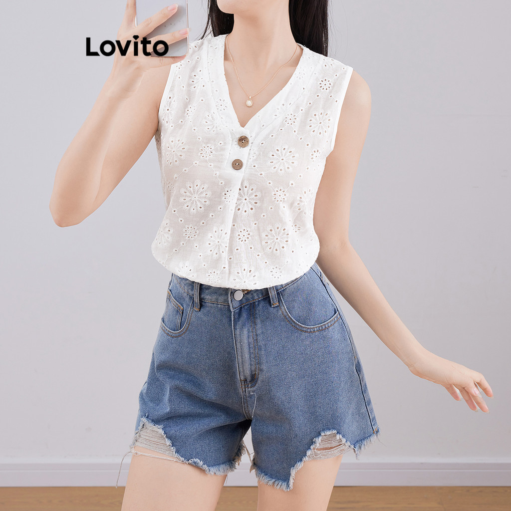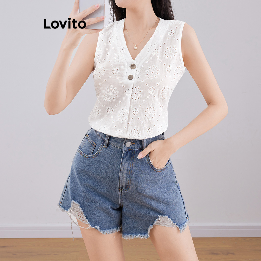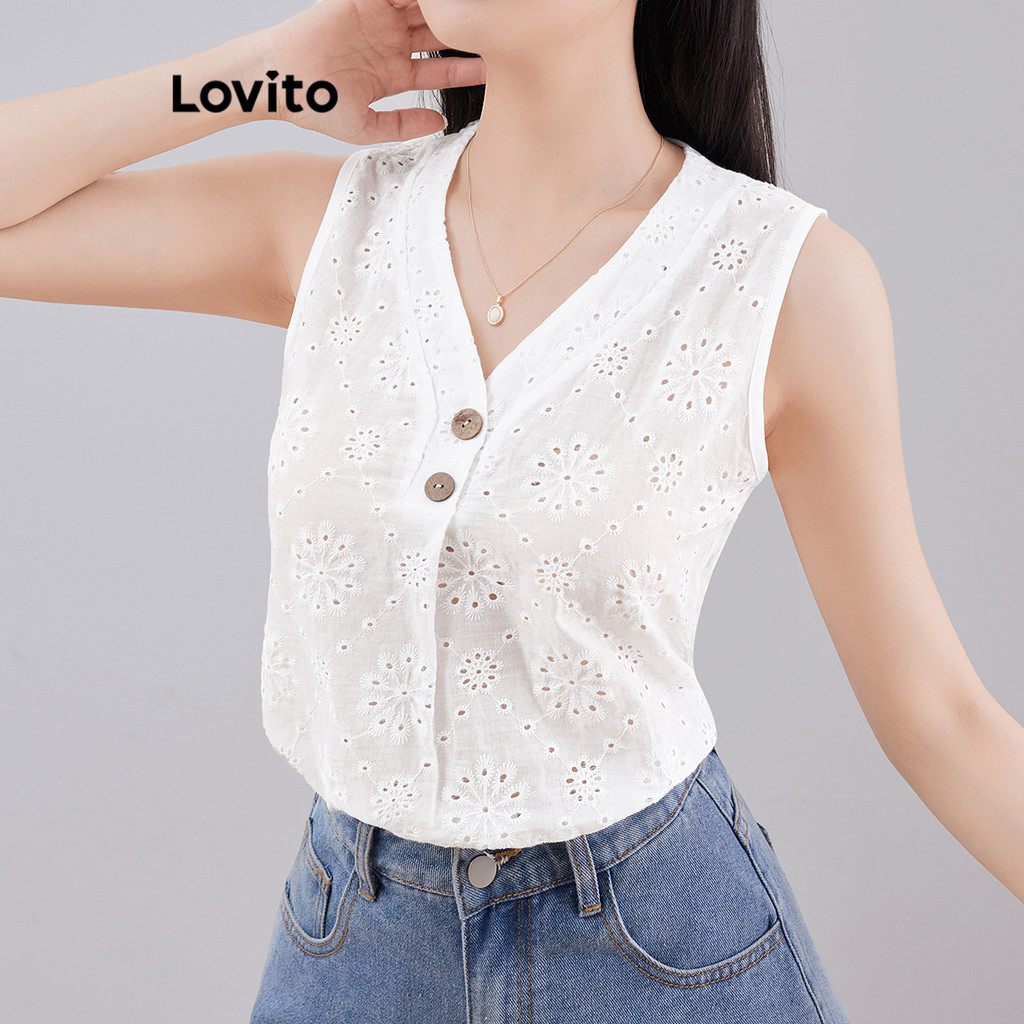 Lovito Boho Top Ilhó Bordado Botão Verão/Primavera Regata Feminina L121MD039
