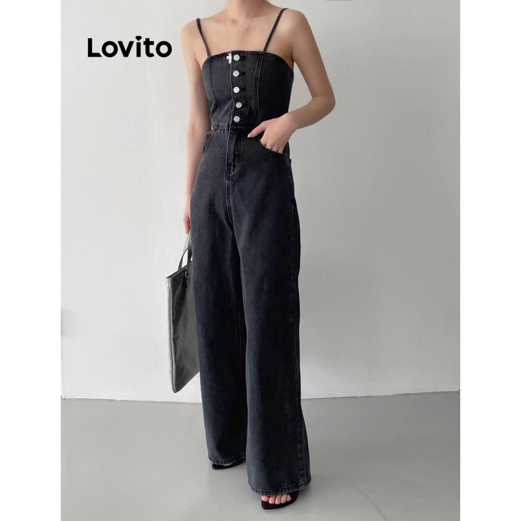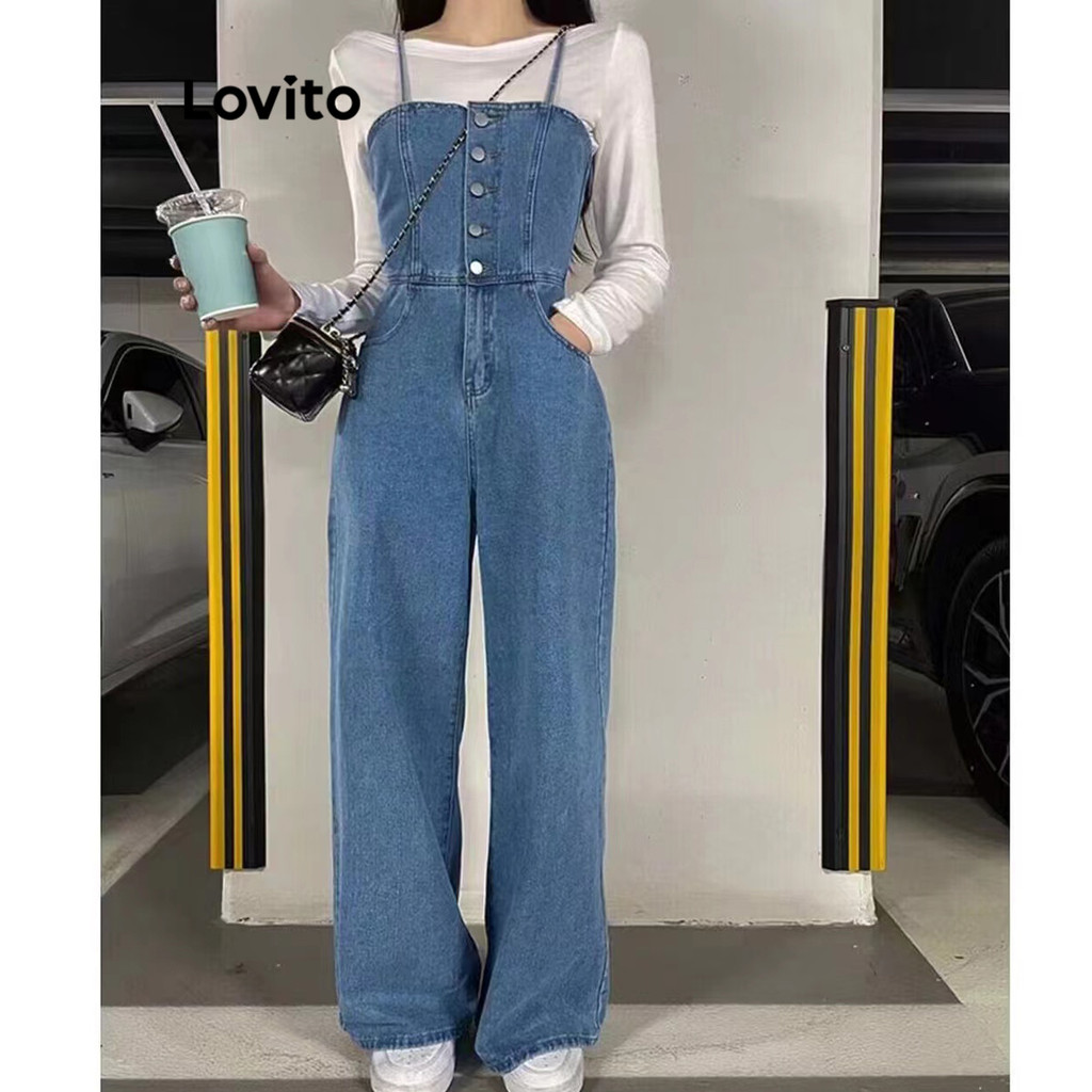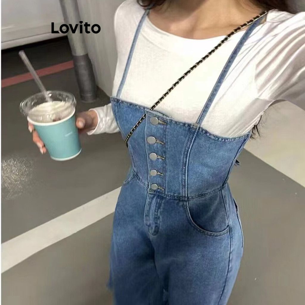 (Hot) Lovito Casual Macacão Feminino Liso Lavado com Bolso e Botão Frontal LNE22047 (Multicolorido)