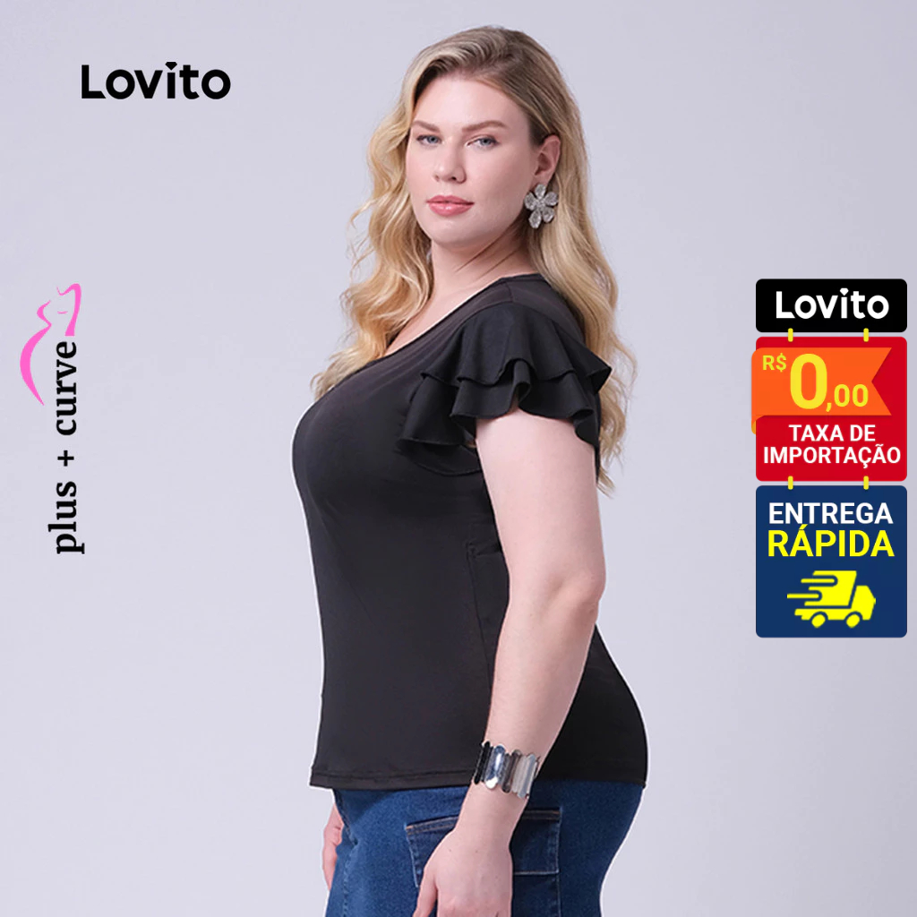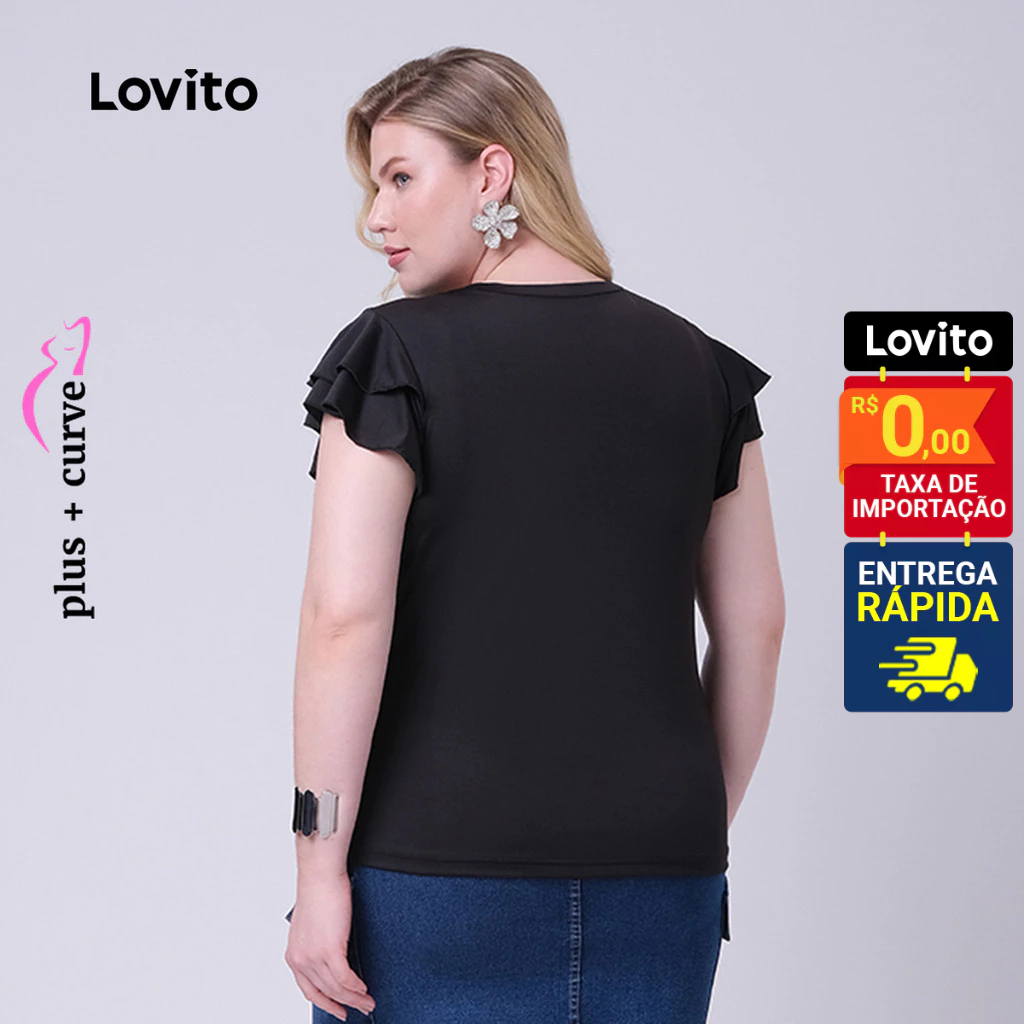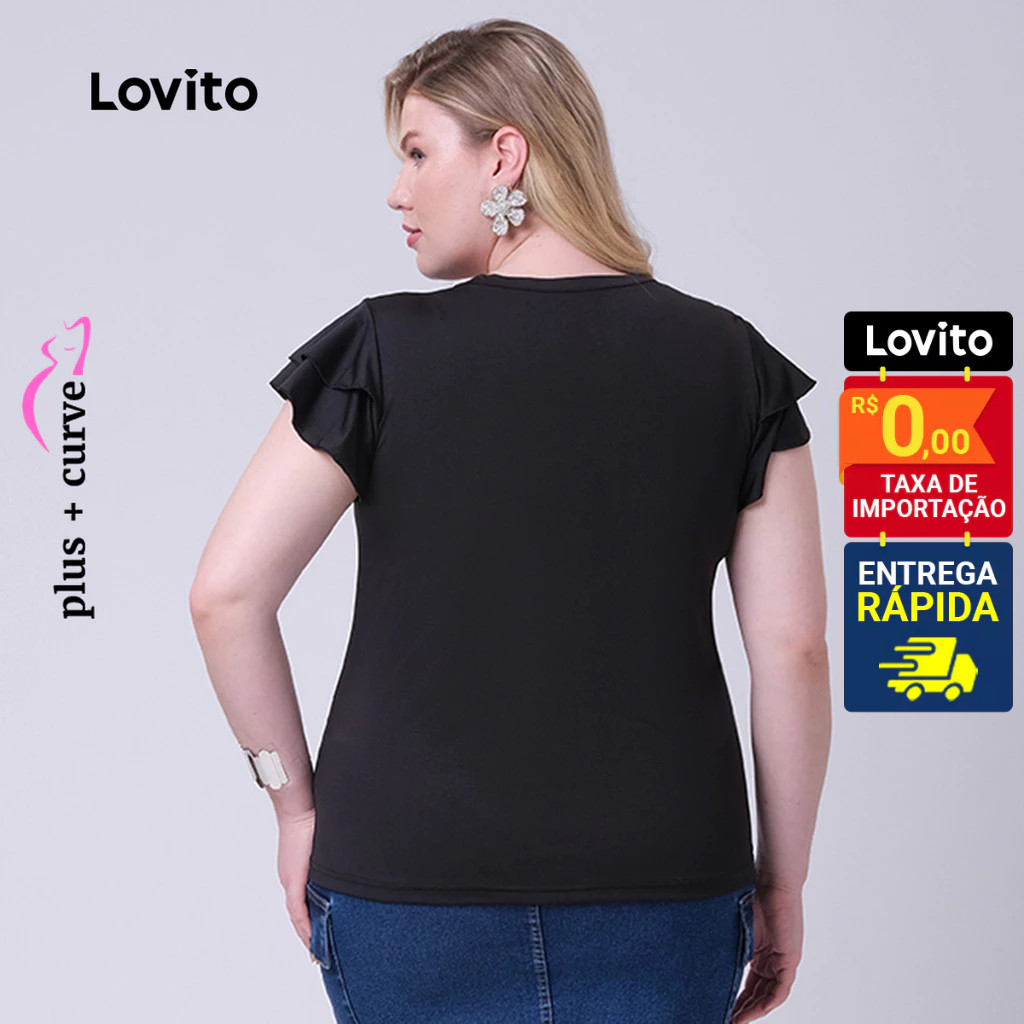 Lovito Camiseta Feminina Manga Curta Casual Lisa Plus Size Curve Manga com Babados LB360BRL389