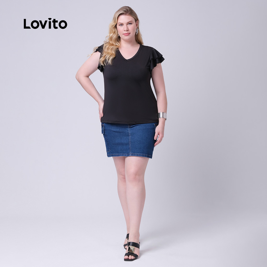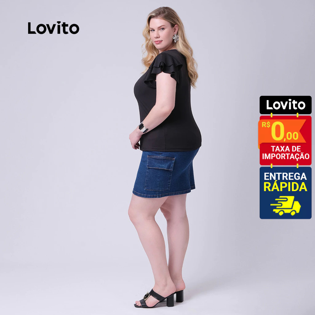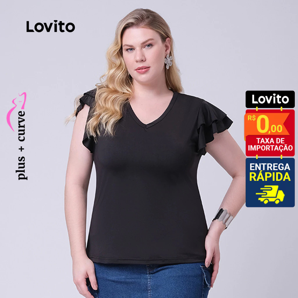 Lovito Camiseta Feminina Manga Curta Casual Lisa Plus Size Curve Manga com Babados LB360BRL389