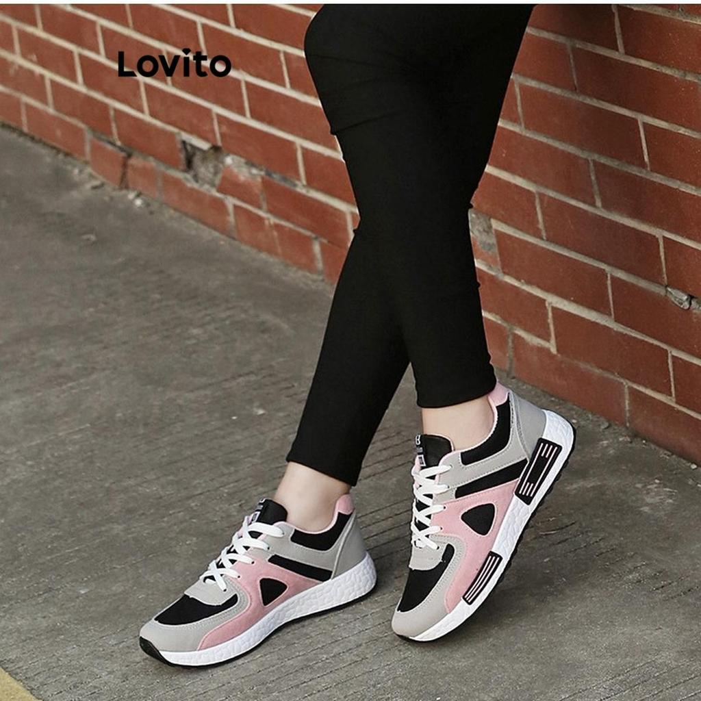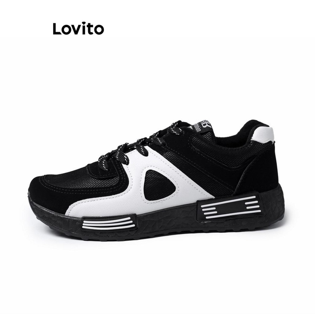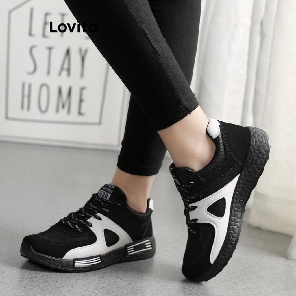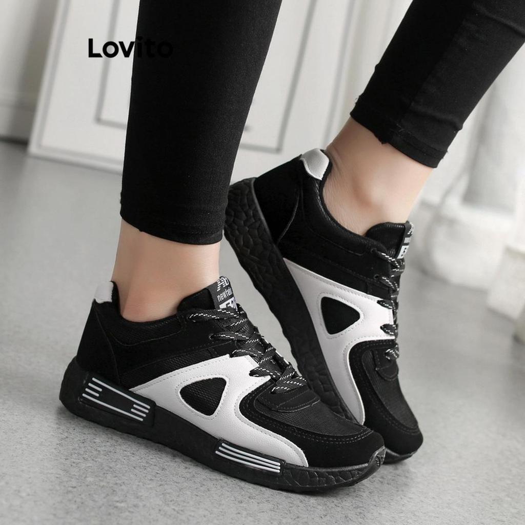 Lovito Esporte Simples Versão Coreana Preto E Branco Cor Combinando Respirável Sapatos Largos Tênis Para Mulher LFA67310