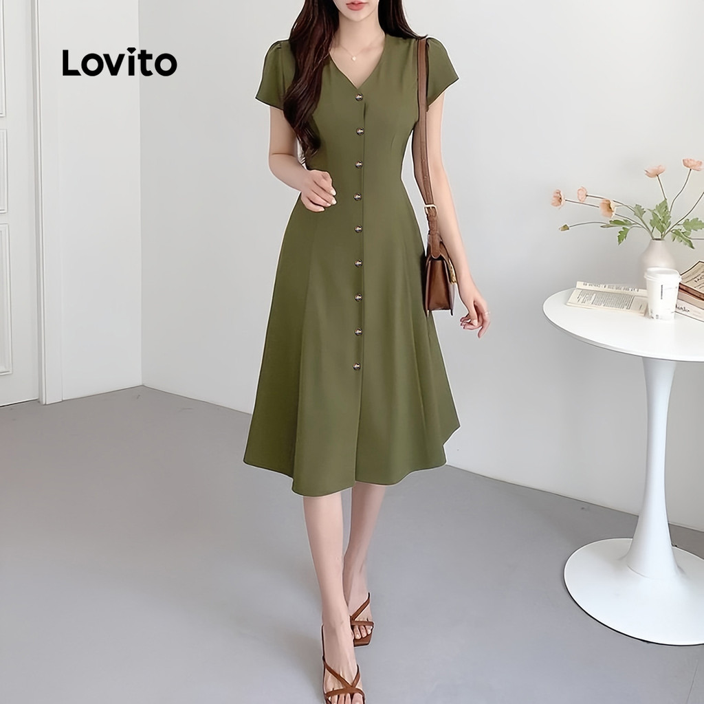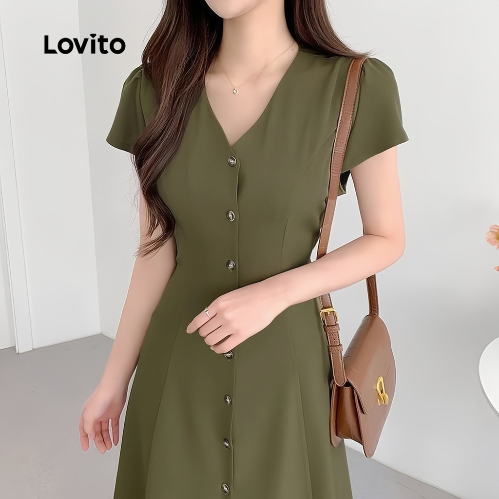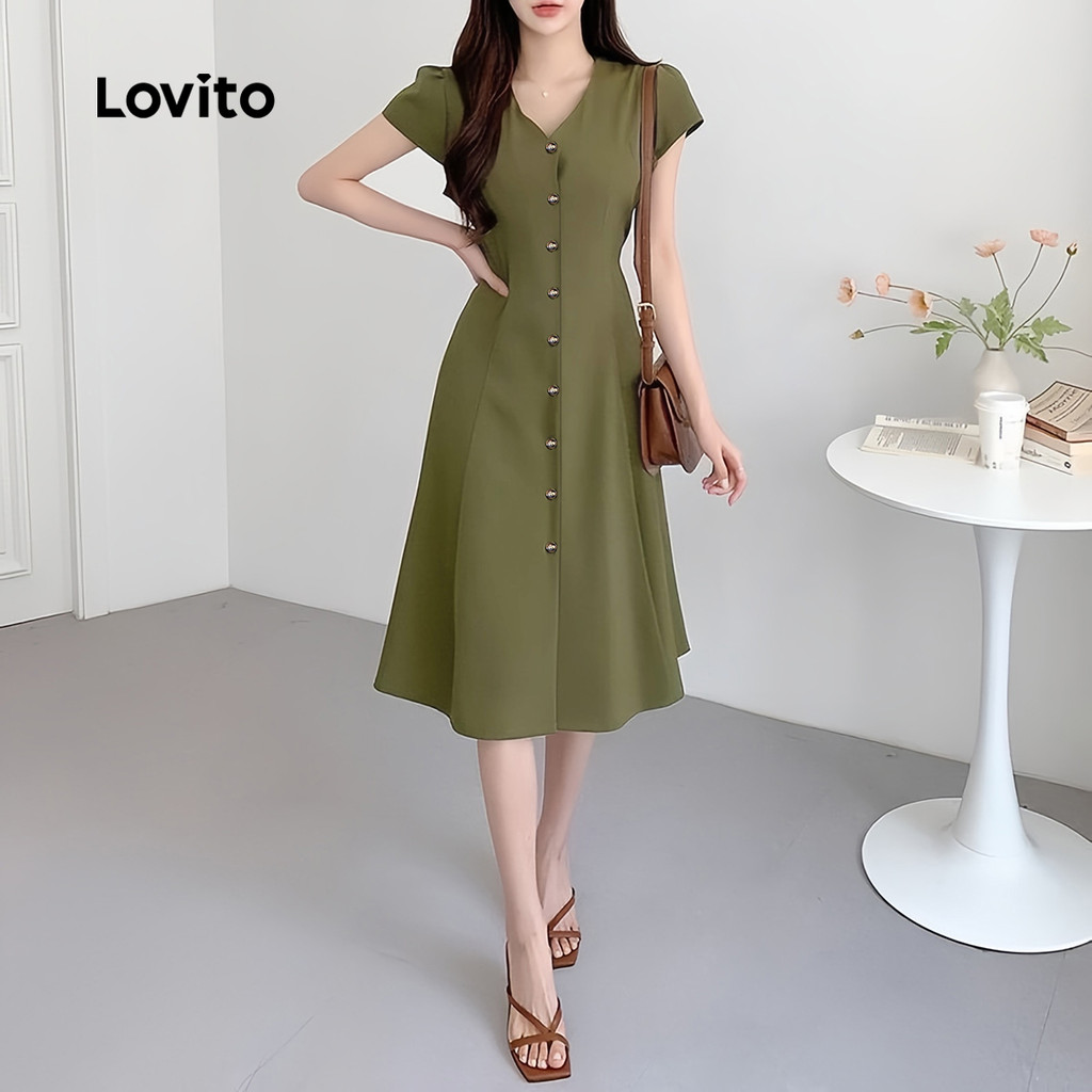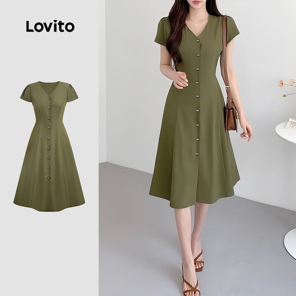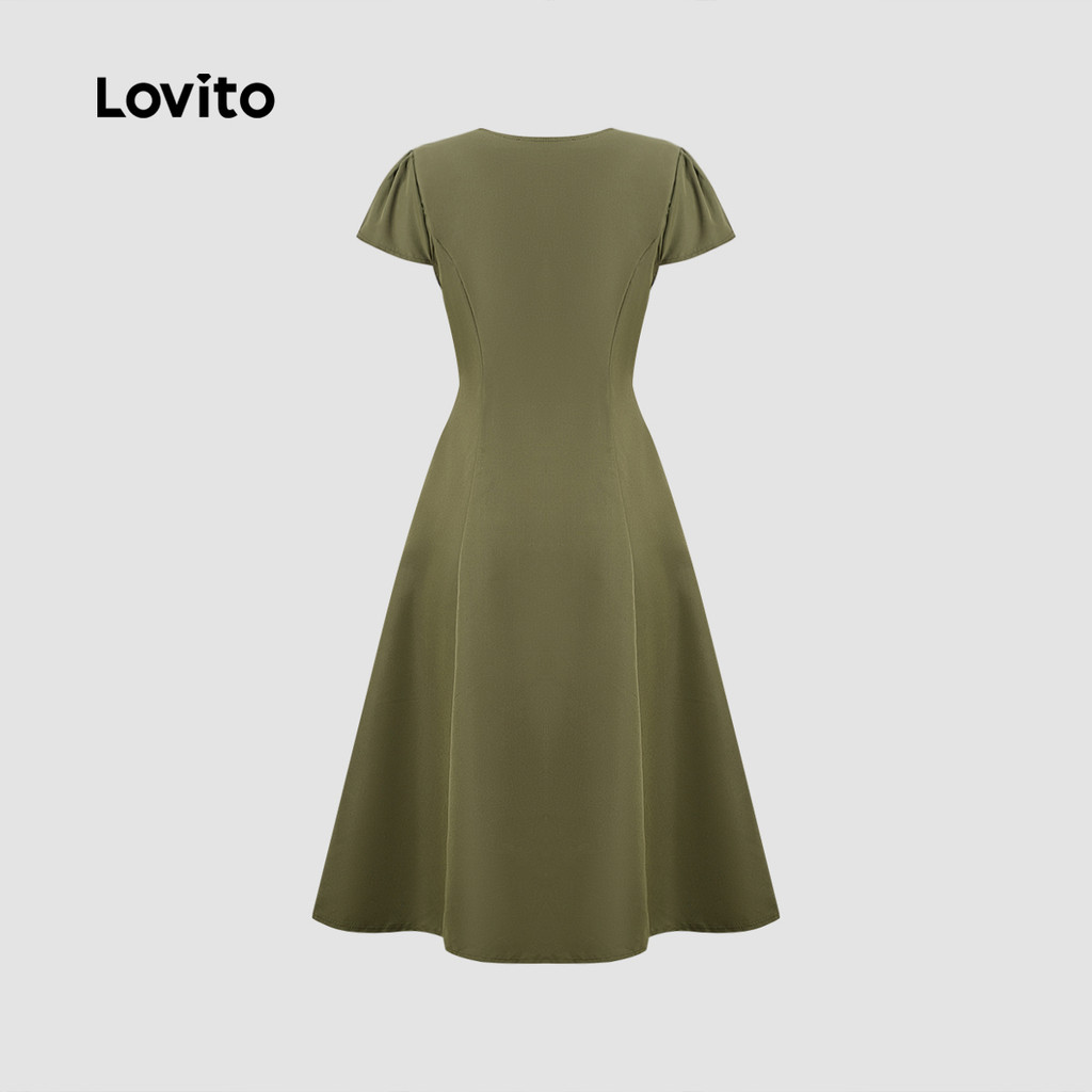 (NEW) Lovito Vestido Casual de Primavera/verão para Mulher em Verde oliva L155AD080