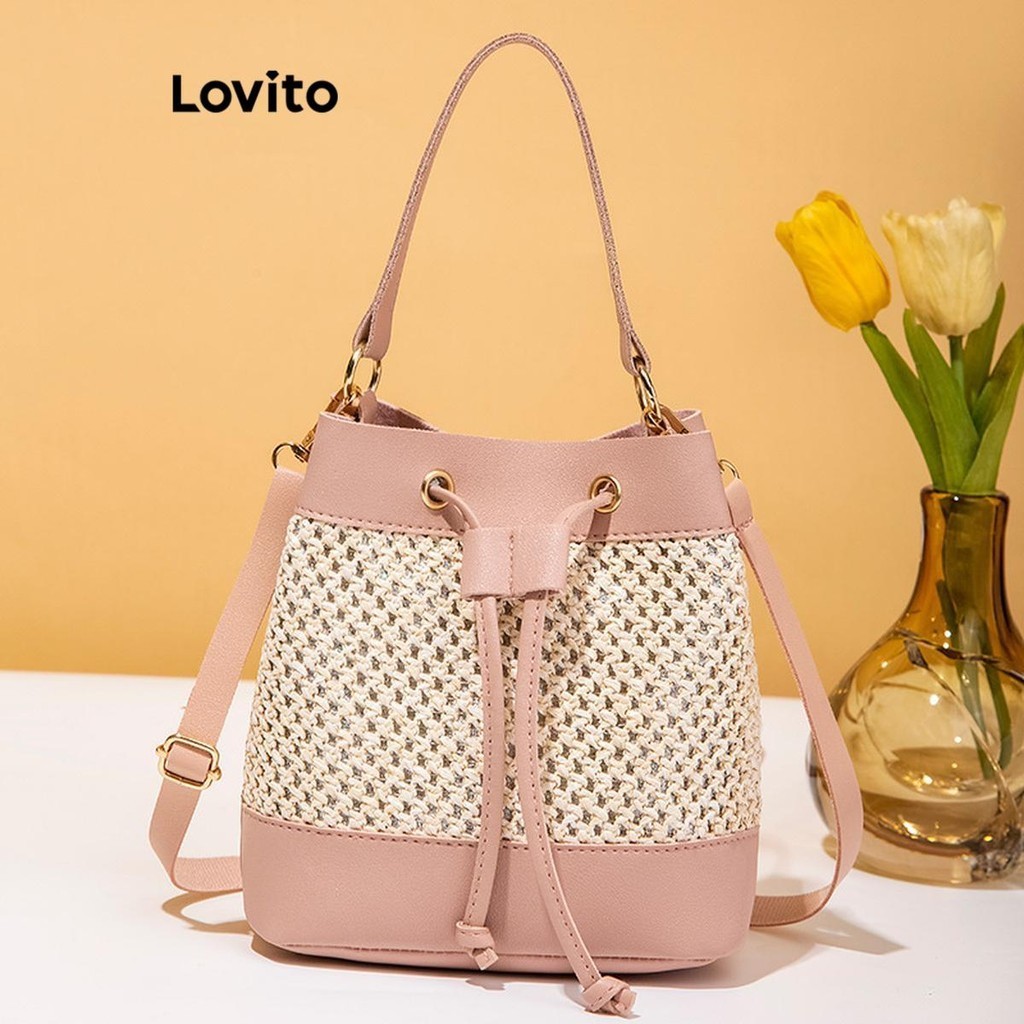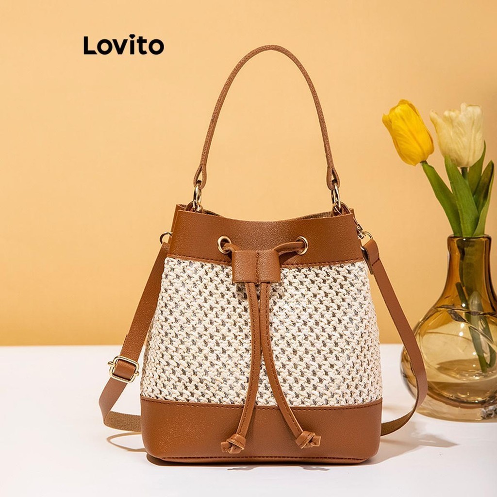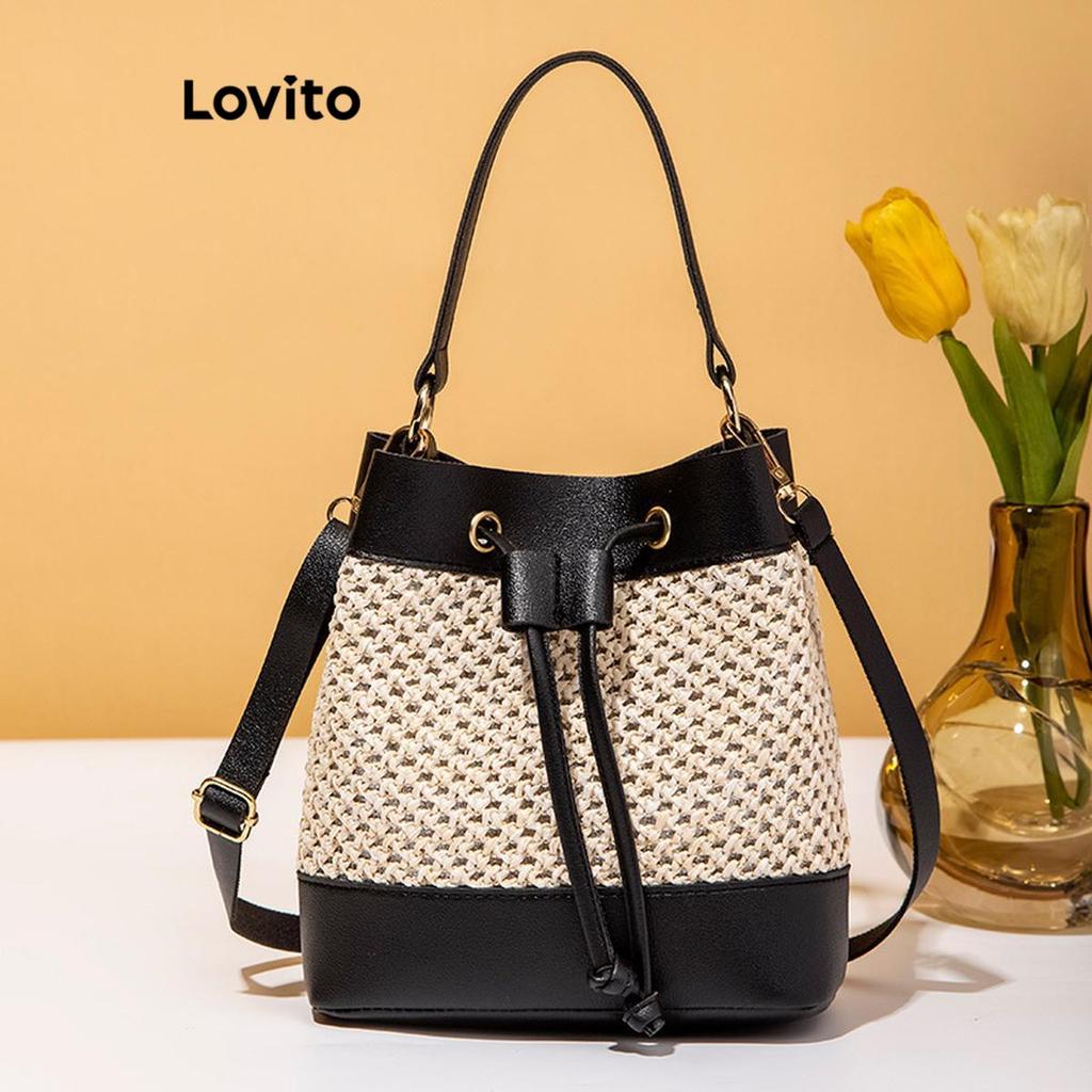 Lovito Casual Bolsa Feminina Simples de Palha com Cordão Colorblock LFA18701