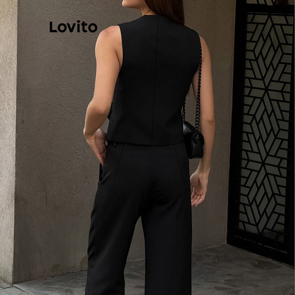 (LIVE STREAM SALE) Lovito Conjunto de Calça Assimétrica com Botão Simples Casual para Mulheres LNL35035 (Damasco/Preto)