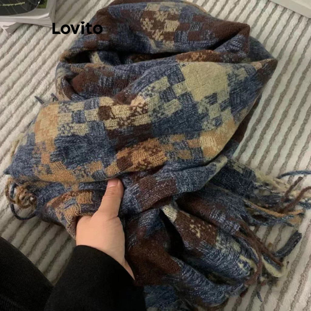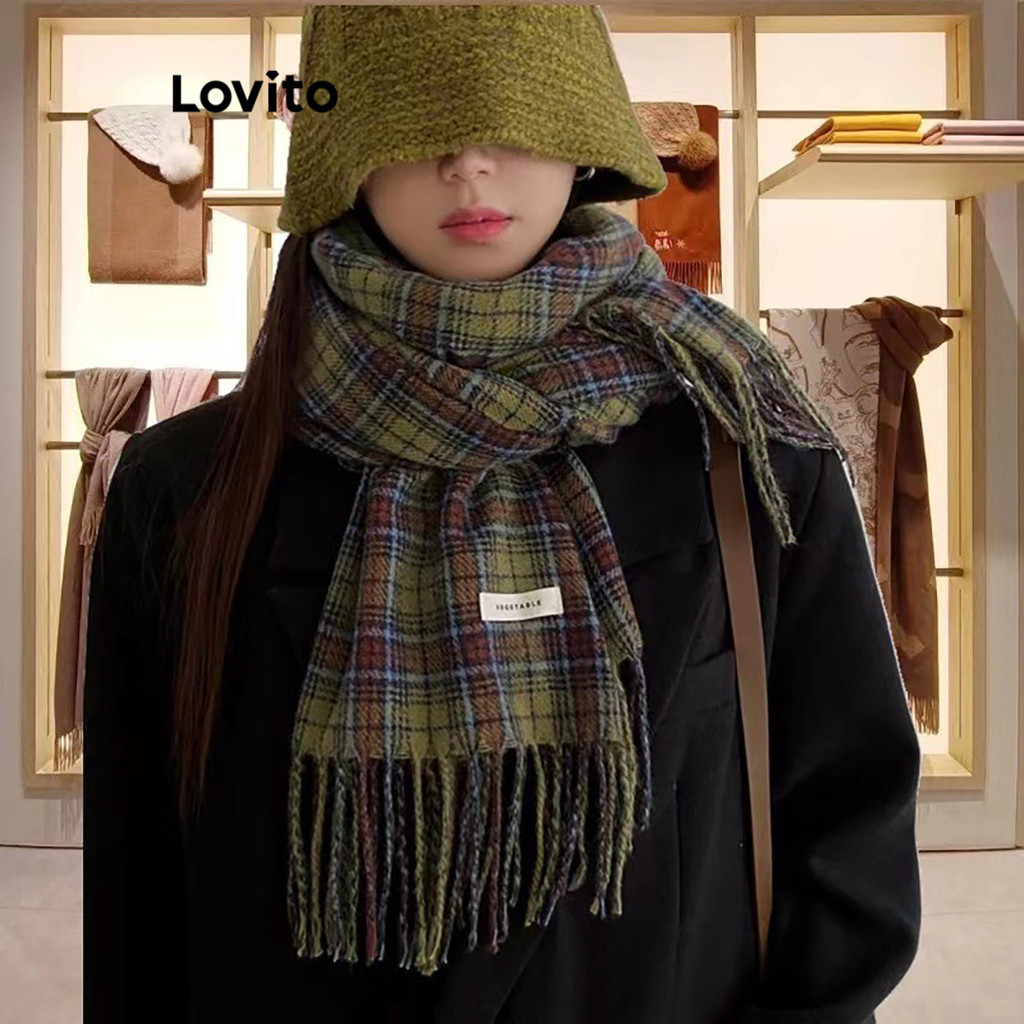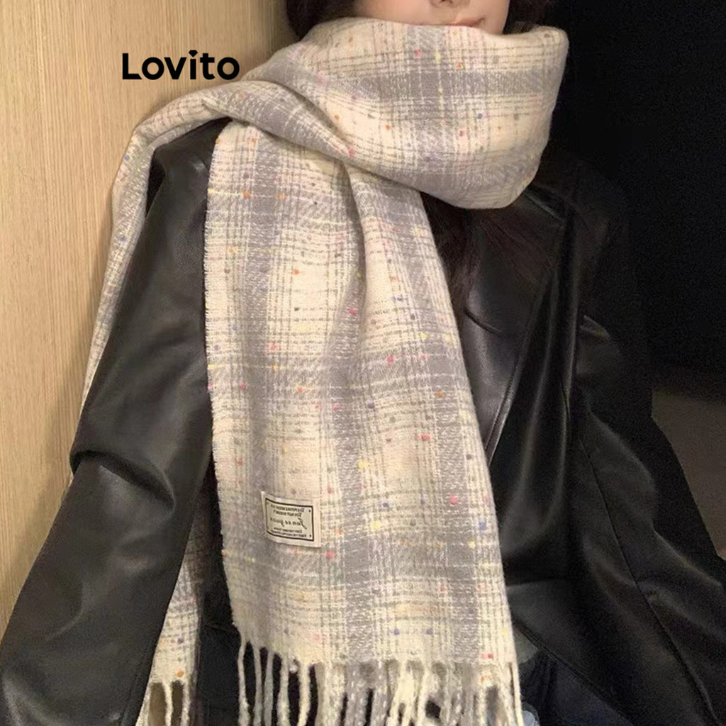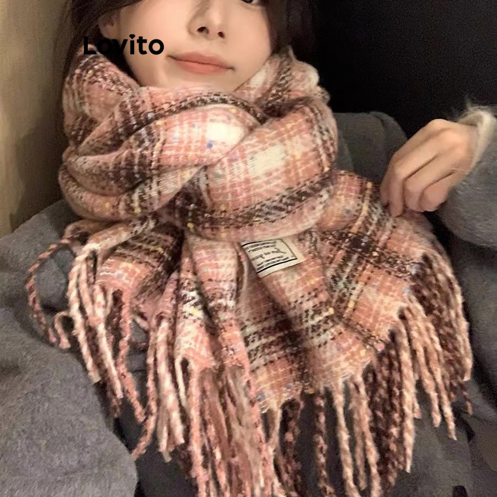 Lovito Vintage Gingham Coreano Xadrez Cachecol Borlas Macias Estudante Casal Atmosfera Cachecol para Mulheres LFA55283