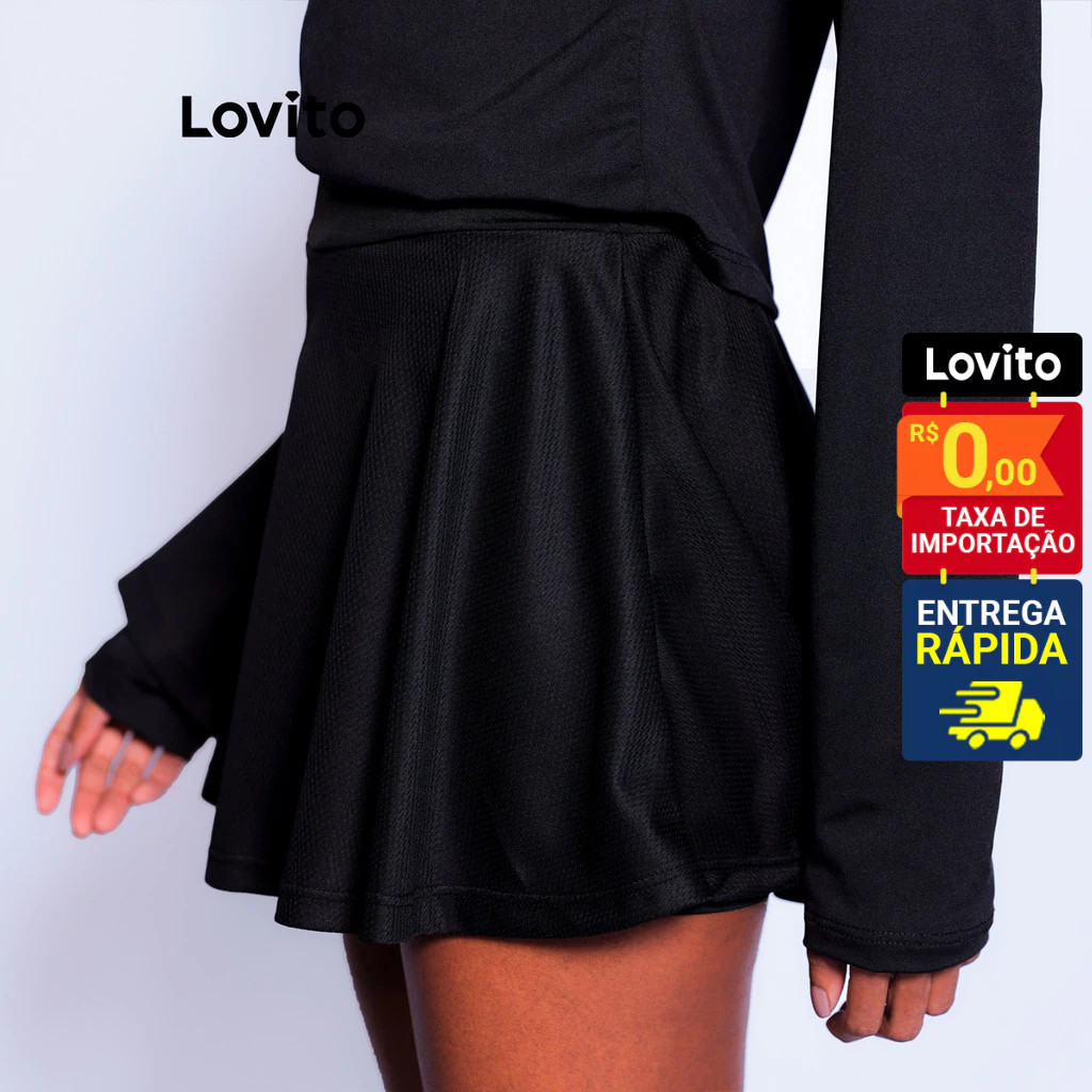 Lovito Saia Esportiva Tenis Curta Rodada Preta Basica Feminina Lisa LB884BRL914
