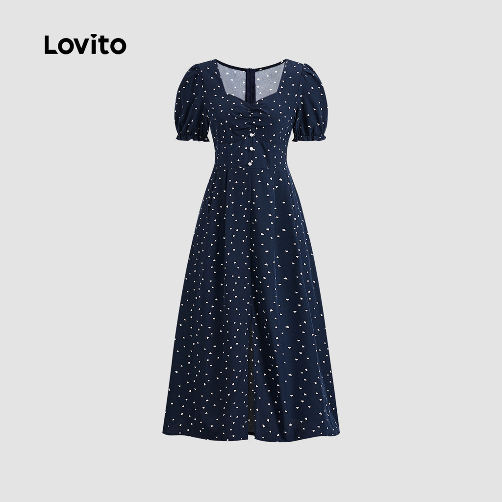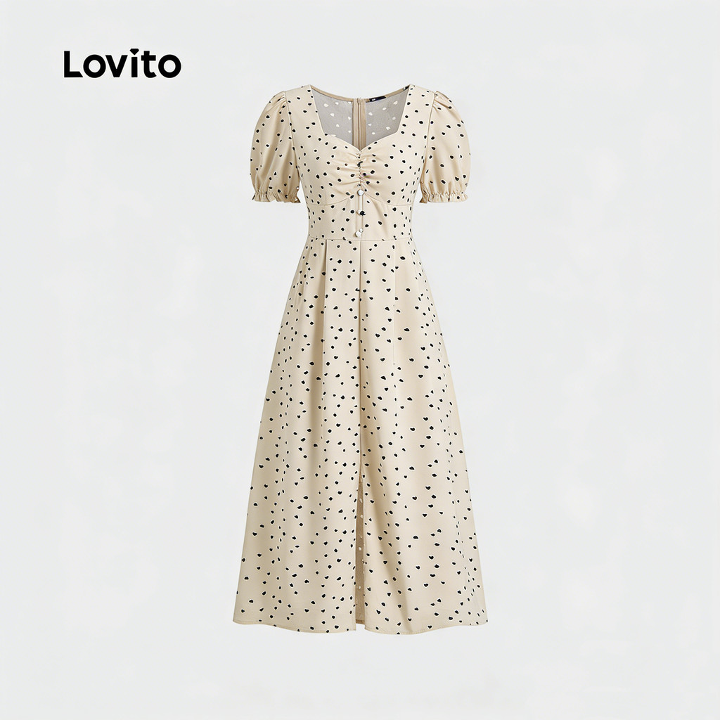 Lovito Vestido Frontais Formato De Coração Mangas Bufantes Redondas Vestido De Verão/primavera Para Mulheres LBL23193